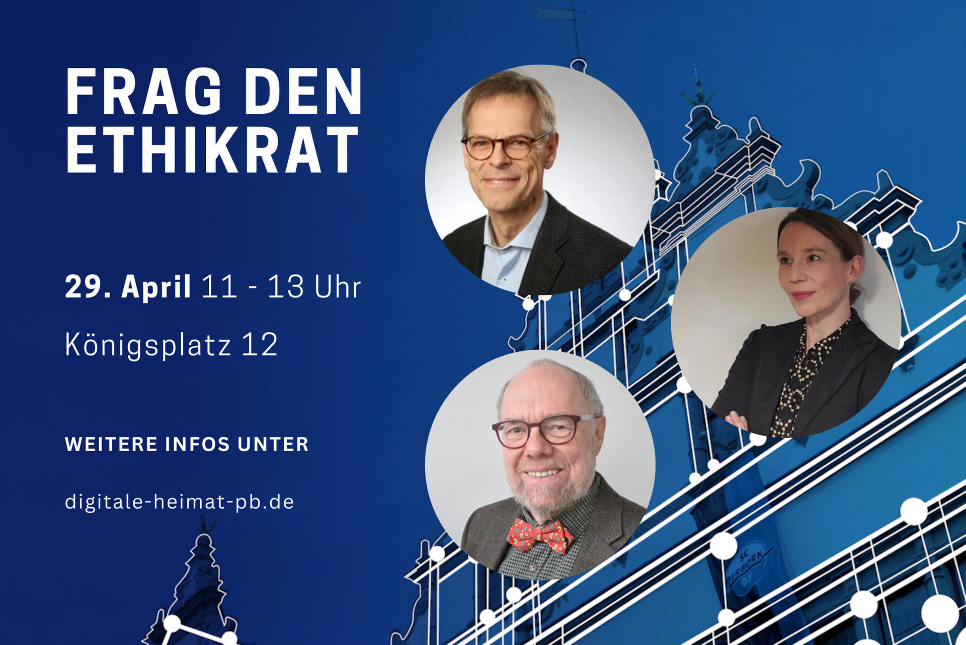 Machen digitale Technologien zukünftig meine Arbeit überflüssig? Ist Künstliche Intelligenz klüger als ich? Wie kontrollieren wir die Technik? Zu diesen und anderen Fragen rund um das Thema Ethik und Digitalisierung können interessierte Bürger*innen am Samstag, den 29. April, 11-13 Uhr, in den Räumlichkeiten der Digitalen Heimat PB am Königsplatz 12 mit dem Ethikrat ins Gespräch kommen.