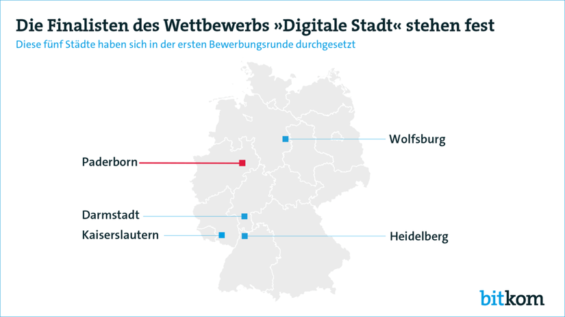 Im Wettbewerb »Digitale Stadt« konnte sich Paderborn neben den weiteren Mitbewerbern Darmstadt, Heidelberg, Kaiserslautern und Wolfsburg für das Finale durchsetzen. In der nächsten Phase des Wettbewerbs geht es nun darum, Konzepte für die möglichen digitalen Angebote, die individuell auf den Bedarf der Stadt zugeschnitten sind, zu erarbeiten. Diese Konzepte werden dann am 31. Mai in Berlin vorgestellt, bevor im Juni dann die Gewinnerstadt bekanntgegeben wird.