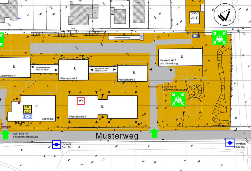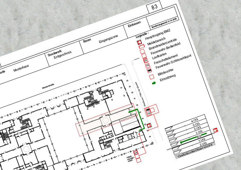 Ähnlich wie die Feuerwehrpläne handelt es sich bei Feuerwehrlaufkarten um den Brandeinsatz unterstützende "Sonderpläne", die für Objekte erforderlich sind, die über eine zur Feuerwehr aufgeschaltete Brandmeldeanlage (Öffnet in einem neuen Tab) verfügen.