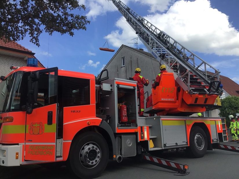 Am heutigen Dienstagnachmittag wurde die Feuerwehr Paderborn unter dem Stichwort Technische Hilfeleistung mit Menschenrettung in den Stadtteil Wewer alarmiert. Ein 85 jähriger Mann hatte bei Arbeiten an einer Dachrinne in ca. 6 m Höhe einen medizinischen Notfall erlitten.