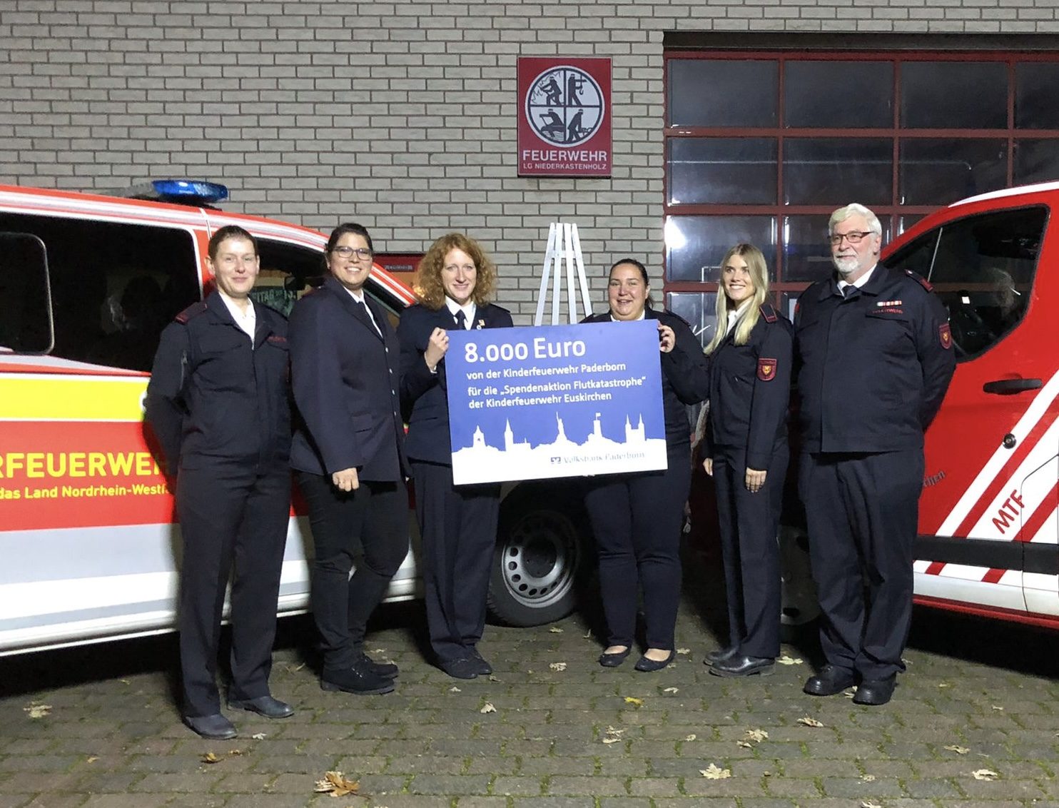 Am 04.November 2021 machten sich Stefanie Elwenspeck und Patrizia Tacke, das Leitungsteam der Kinderfeuerwehr Paderborn auf den Weg nach Euskirchen, um dort den Spendenschein mit der beeindruckenden Summe von 8000,00 € zu übergeben. „Wir sind überwältigt von der Spendensumme, mit der wir niemals gerechnet haben! Mit dem Geld werden wir den Kindern das kaufen, was ihnen fehlt, um wieder ein halbwegs normales Leben zu haben oder wir werden mit ihnen einen Ausflug organisieren, um sie vom Alltag abzulenken.“, erzählt Jessica Walz. Auch das Team der Kinderfeuerwehr ist positiv überrascht über die Spendenbereitschaft der Bürger. „Als die ersten Spenden eingingen und wir den immer weiter steigenden Betrag gesehen haben, waren wir beeindruckt von so großer Hilfsbereitschaft“, berichtet Stefanie Elwenspeck und Patrizia Tacke ergänzt: „Wir danken jedem einzelnen für die Spenden und sind uns sicher, dass sie einen guten Zweck erfüllen.“ Neben vielen privaten Spenden haben auch einige Wachabteilungen der hauptamtlichen Feuer- und Rettungswachen, sowie einige Löschzüge und Abteilungen gespendet. Getreu dem Motto der Feuerwehr: „Einer für alle, alle für einen!“