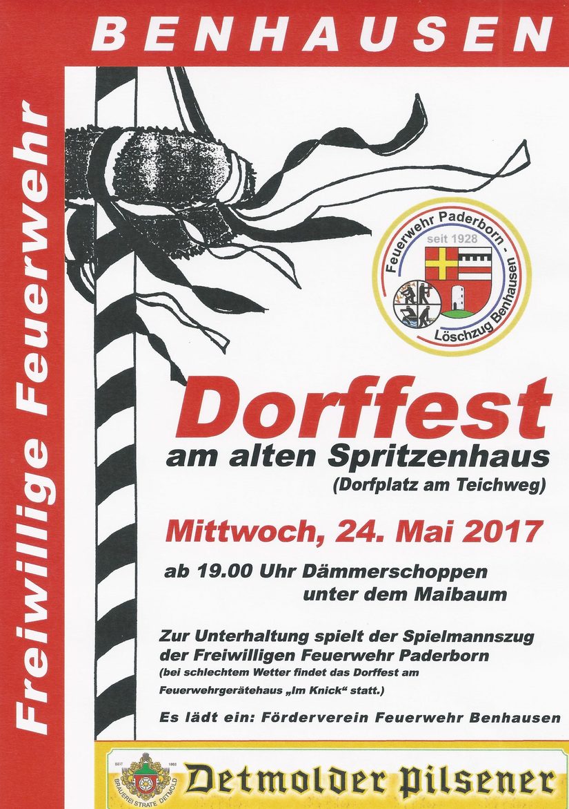 Der Förderverein des Löschzuges Benhausen der Freiwilligen Feuerwehr Paderborn lädt ein - Dorffest am 24. Mai am alten Spritzenhaus.