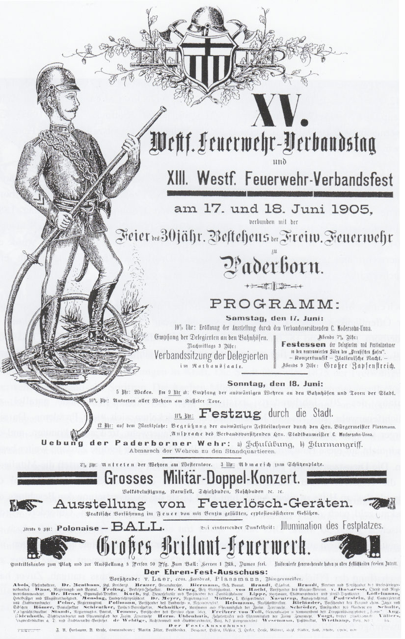 Ein Plakat aus dem Jahr 1905 vom XV. Westfälischen Feuerwehrverbandstag, der am 17.06. und 18.06.1905 in Paderborn anlässlich des 30-jährigen Bestehens der Feuerwehr stattfand, gab den Ausschlag zur Bildung einer historischen Abteilung bei der Feuerwehr Paderborn.