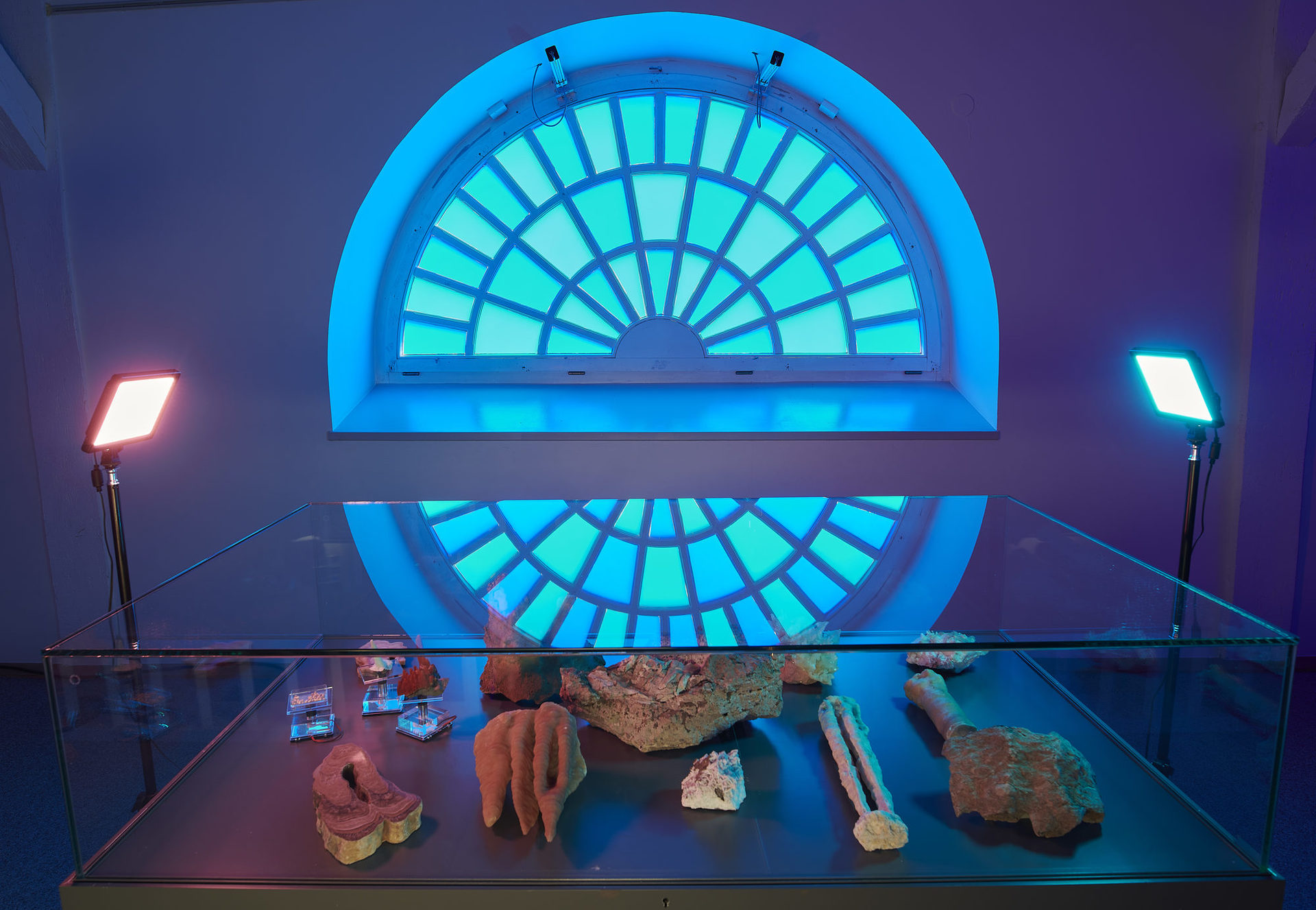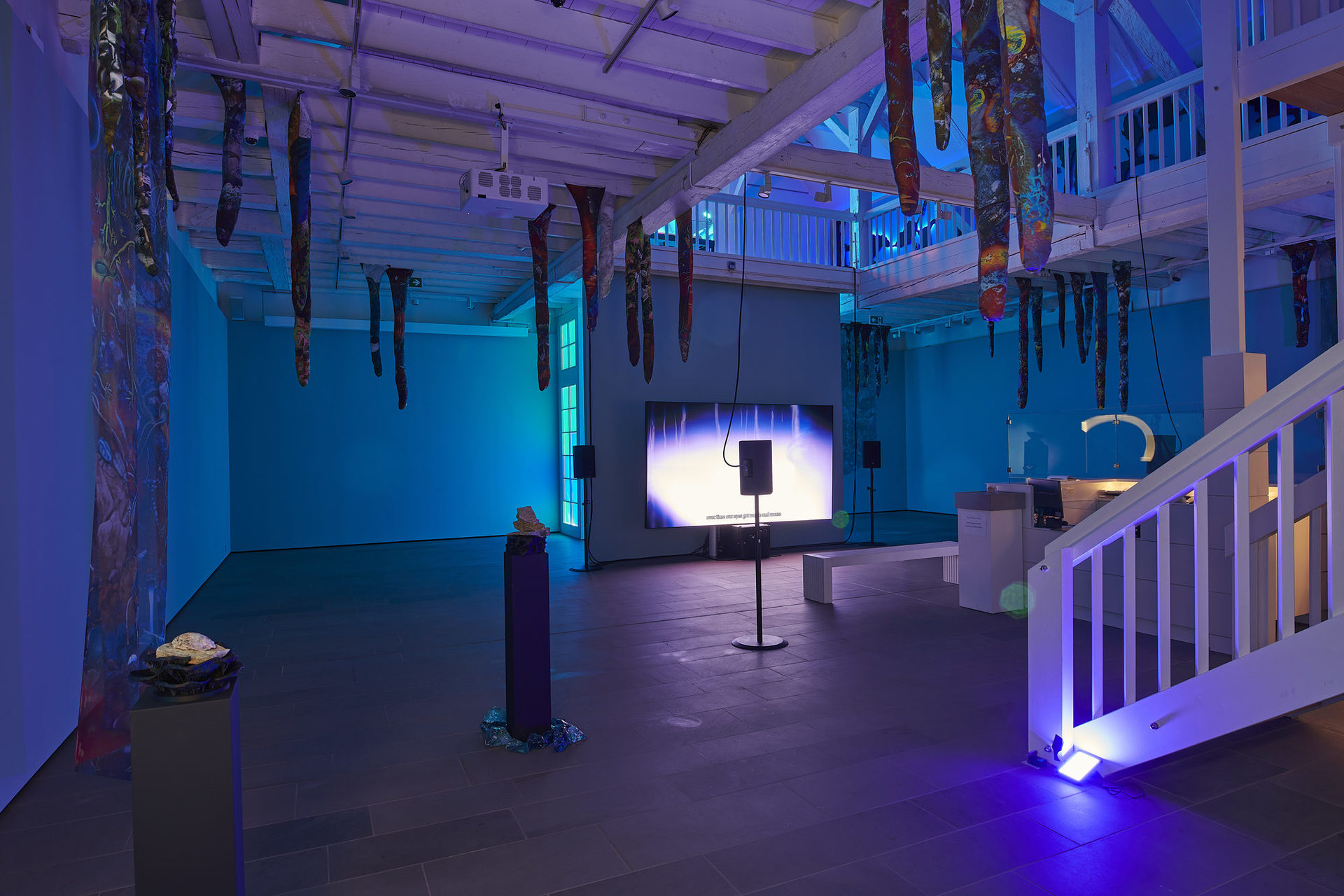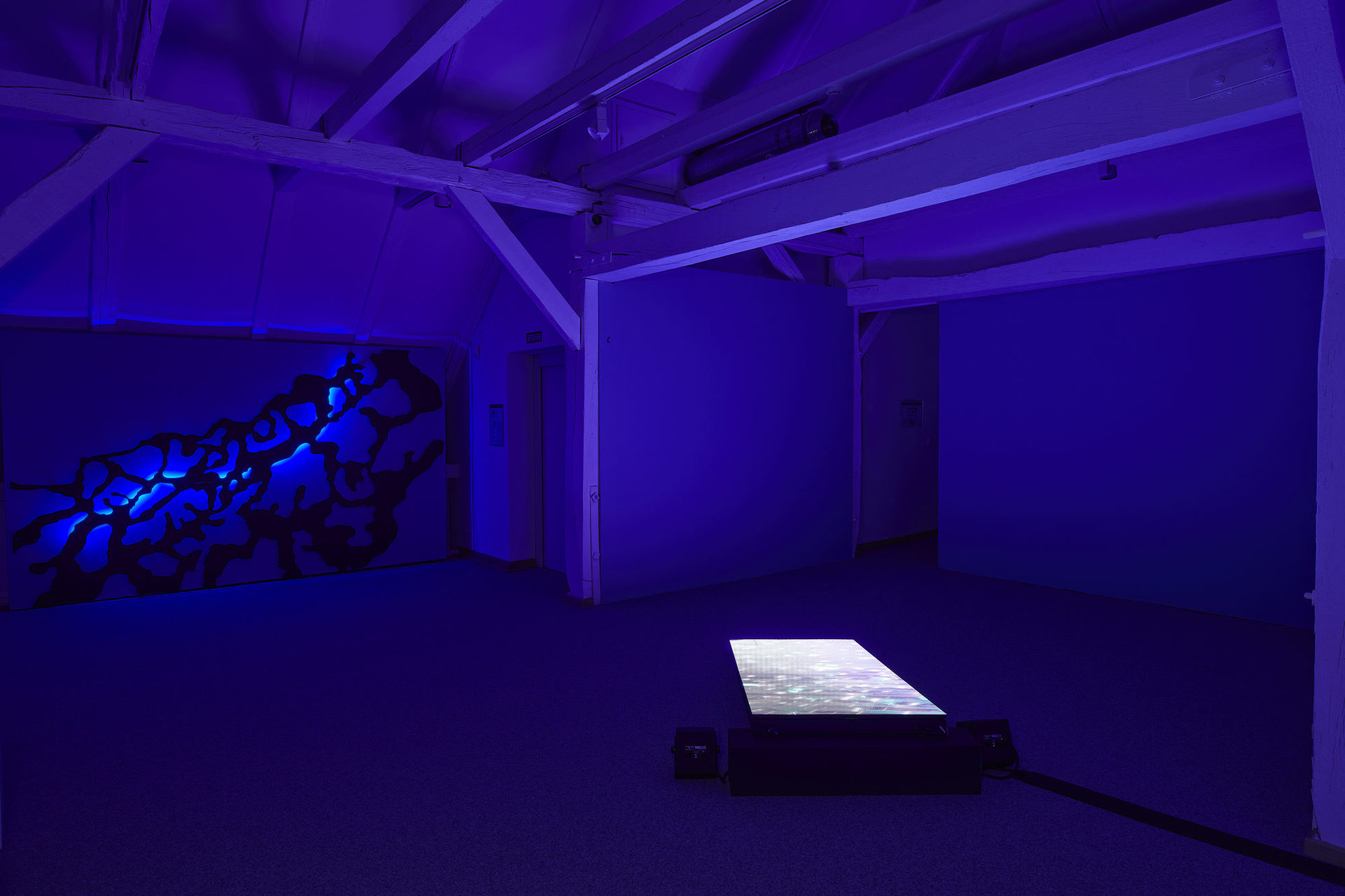 In ihrer raumgreifenden Installation vereinen sie Sound, Licht und digitale Kunst zu einer immersiven Parallelwelt, die dazu einlädt, Zeit und Raum anders wahrzunehmen. Wie durch ein Schluckloch im Gestein folgt man dem Wasser durch komplexe Höhlensysteme, begegnet winzigen Organismen wie Höhlenkäfern — und hört Geschichten von Flora und Fauna. Nicht-menschliche Nachbarn erhalten Stimme und berichten von Leben, Überleben und Anpassung.
