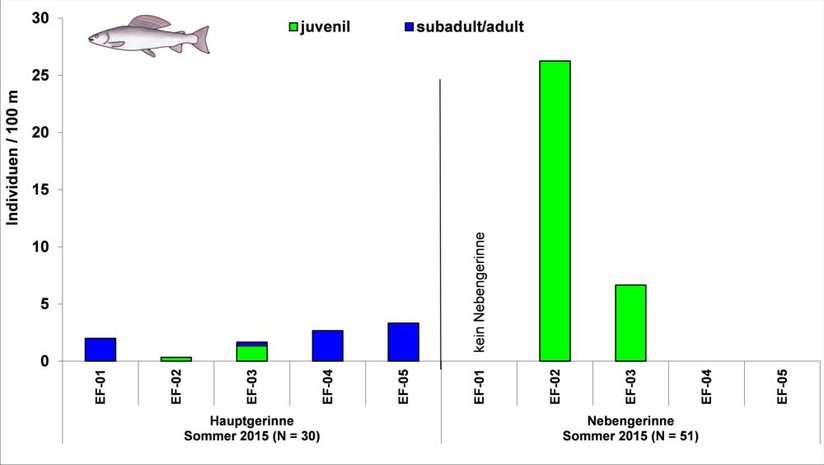© NZO-GmbHErfolgskontrolle an der Pader: Äschenbestand 2015 - Während die ausgewachsenen Äschen (blau) hauptsächlich das Hauptgerinne der Pader nutzen, bieten die Nebenarme (rechts) vor allem für junge Äschen einen Rückzugsraum.