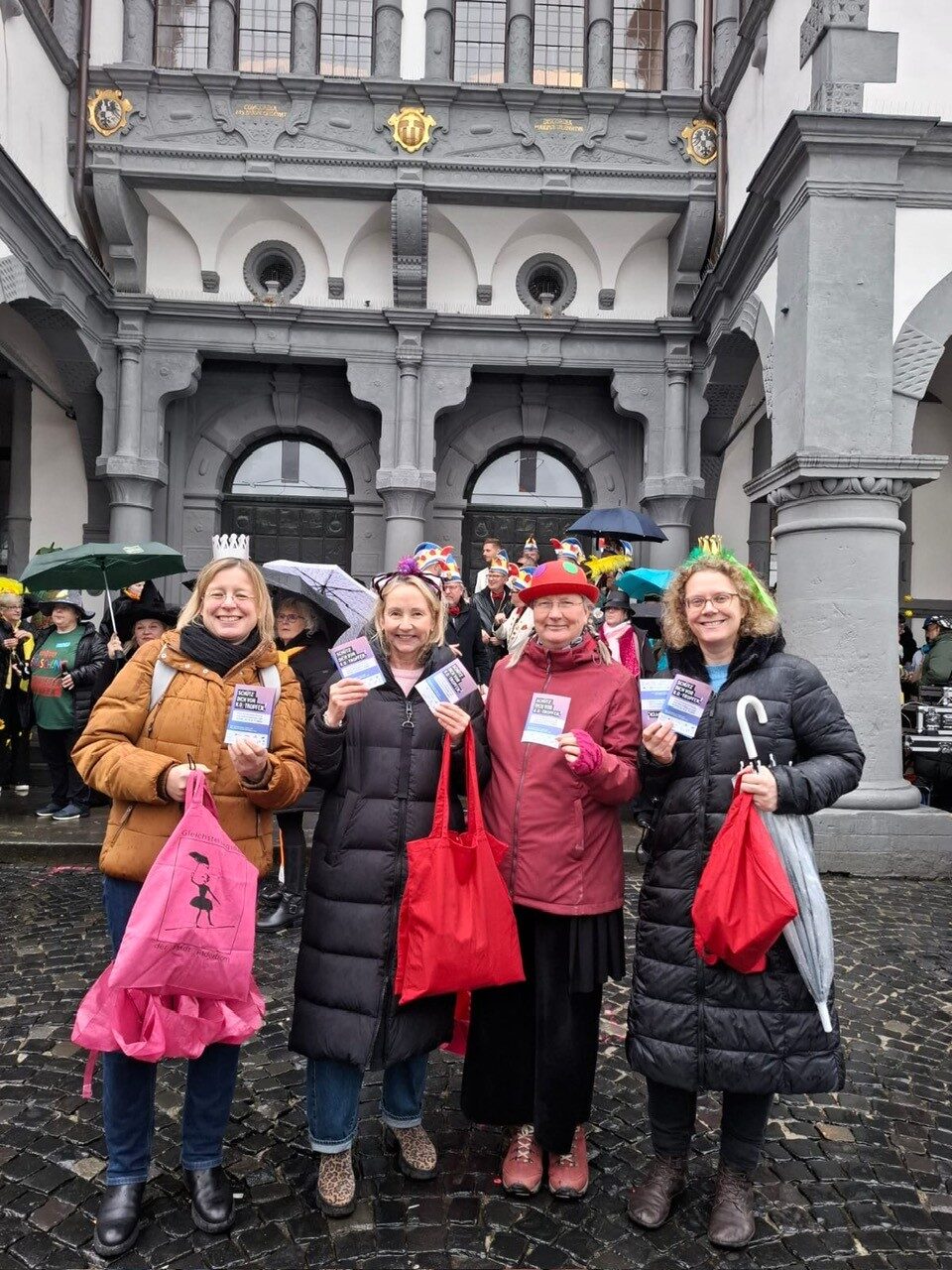 „Es ist wichtig, immer wieder auf die Gefahren, die durch K.O.-Tropfen drohen, aufmerksam zu machen und zur Vorsicht aufzurufen“, so die städtische Gleichstellungsbeauftragte Dagmar Drüke. Gesagt – getan! Mit ihrem Team verteilte sie an Weiberfastnacht vor dem Rathaus wieder Infoflyer und Getränkeabdeckungen gegen K.O.-Tropfen, die einen gewissen Schutz gegen die gefährlichen Substanzen bieten, die vor allem – aber nicht nur! – Mädchen und jungen Frauen heimlich ins Getränk geträufelt werden. „Die mit den Flyern verteilten Getränkeschutzdeckel können einen zusätzlichen Schutz bieten, sind aber kein Garant für absolute Sicherheit,“ so Drüke. „K.O.-Tropfen können auch durch sog. „Needle Spiking“ über Spritzen, in Speisen oder als scheinbar harmloses Medikament verabreicht werden. Der beste Schutz ist Vorsicht!“