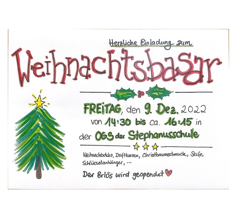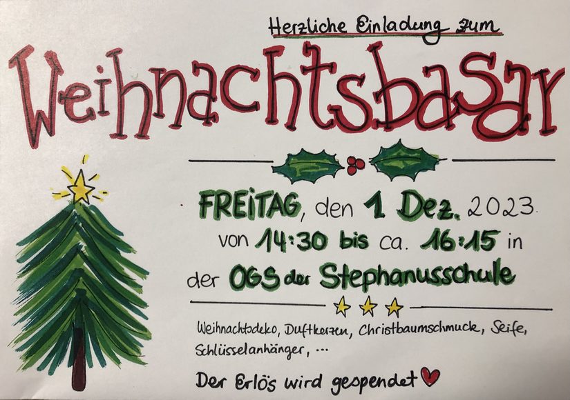 die Adventszeit steht vor der Tür - und damit der traditionelle Weihnachtsbasar der OGS der Stephanusschule. Dazu laden wir herzlich ein, gemeinsam mit uns in vorweihnachtlicher Atmosphäre zu stöbern und zu staunen. Unsere Schülerinnen und Schüler haben in den letzten Wochen mit viel Liebe, Kreativität und Fleiß wunderschöne Dinge hergestellt. Wir freuen uns auf einen gemütlichen Nachmittag. Kommen Sie vorbei und lassen Sie sich von der besonderen Weihnachtsstimmung anstecken!
