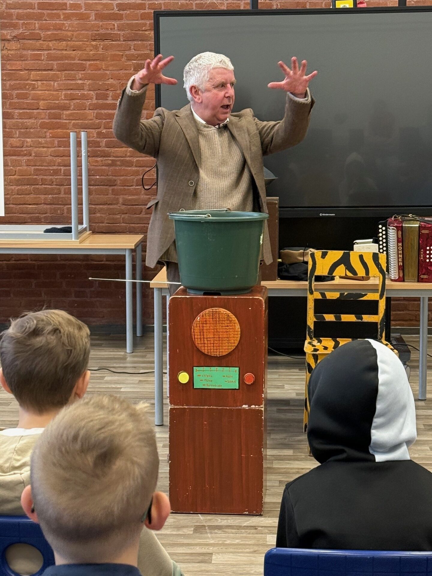 Mit Obstkisten kann man auch gestalten, Buchstaben zum Beispiel, wie man es in der Aula userer Schule sehen kann.