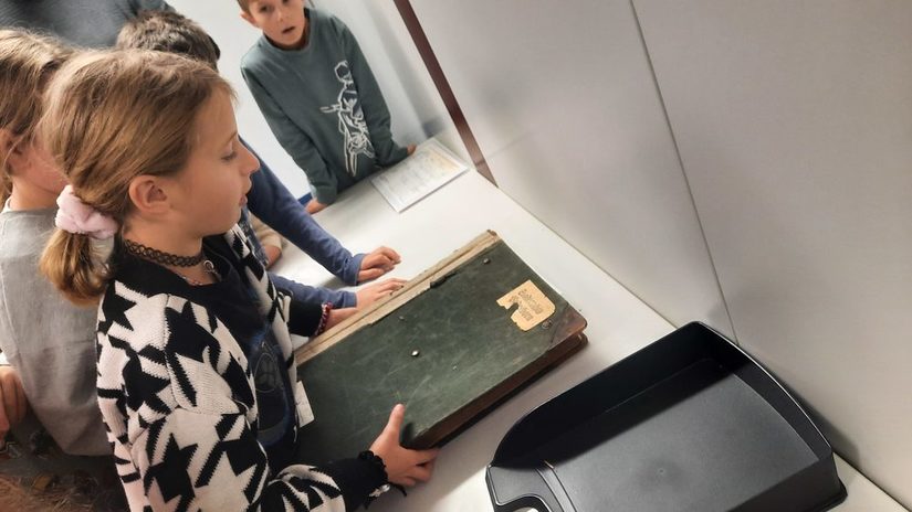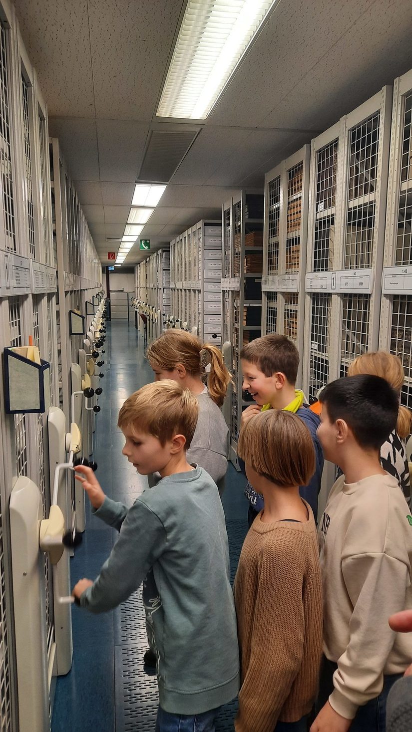 Im November waren wir, die Klasse 4b, wieder als Kulturstrolche unterwegs. Diesmal führte uns unser Weg zum Stadt- und Kreisarchiv Paderborn. Zuerst führte Herr Grabe uns in die Aufgaben eines Archivs ein. Anschließend schauten wir uns alte Postkarten von Elsen an und konnten uns durch zwei alte schwarzweiß Filme einen Eindruck von der Hochwasserkatastrophe in Paderborn in den 60er Jahren machen. Als Nächstes durften wir unser eigenes Wappen gestalten. Am Spannendsten war der Rundgang durch das Archiv, bei dem wir sogar eine Urkunde begutachten durften, die von Queen Elizabeth II bei einem früheren Besuch in Paderborn unterschrieben wurde.