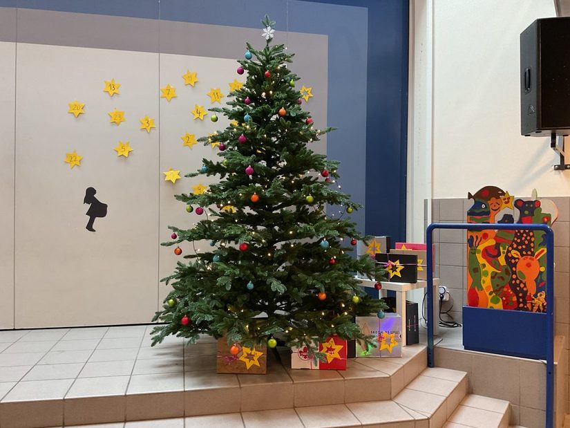 Auch die Aula der Schule erstrahlt bereits in vorweihnachtlichem Licht. Ein schön geschmückter Weihnachtsbaum steht seit einigen Tagen im Eingangsbereich und auch der große Adventskranz hängt bereits mitten in der Aula. In diesem Jahr ist ein ganz besonderes Highlight der klassenübergreifende Adventskalender, den Frau Thater zusammen mit einigen Kindern der dritten und vierten Klassen gebastelt hat.