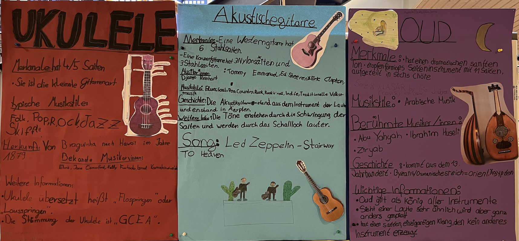 Die fertigen Plakate sind nun in der Aula ausgestellt und laden dazu ein, mehr über die faszinierende Welt der Gitarren zu erfahren.