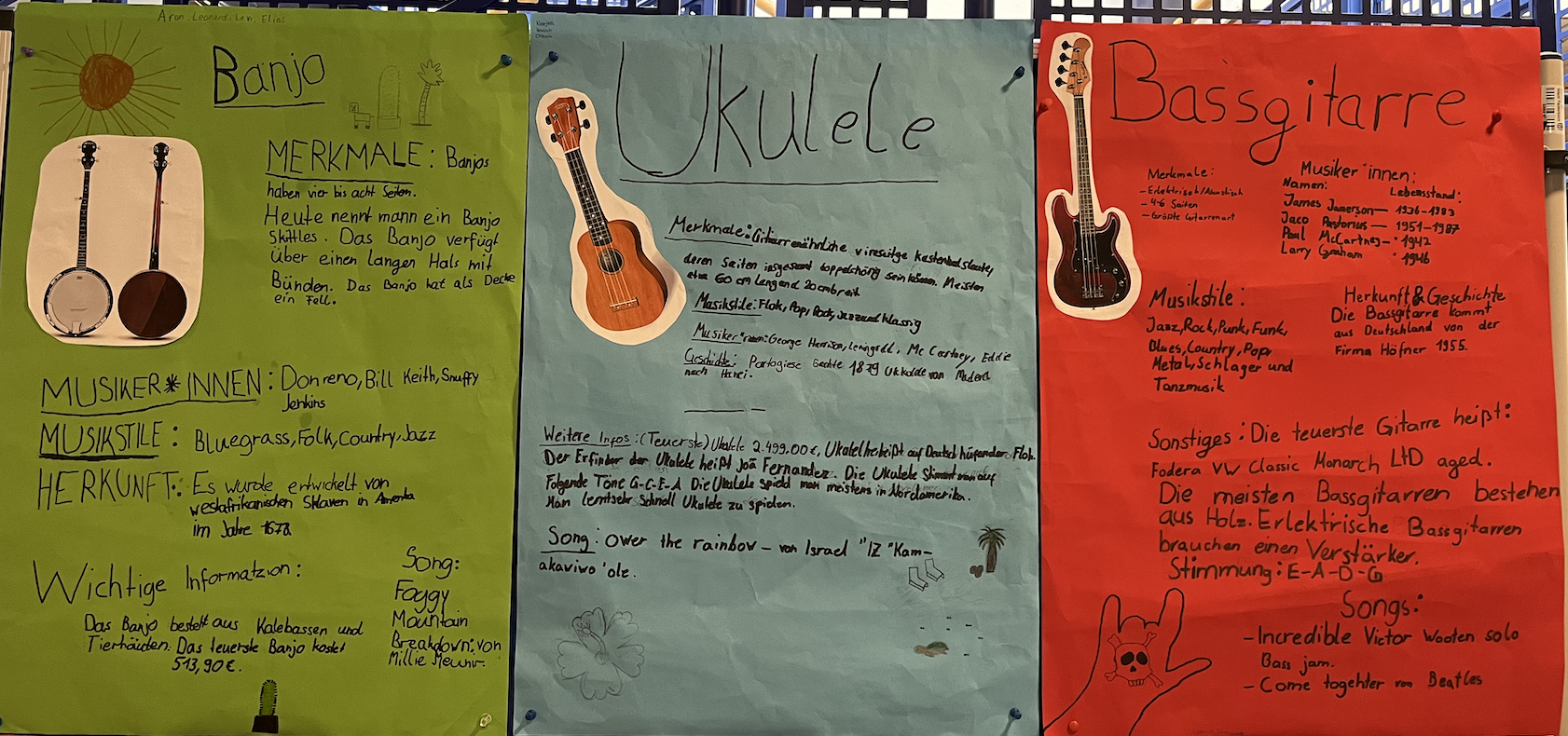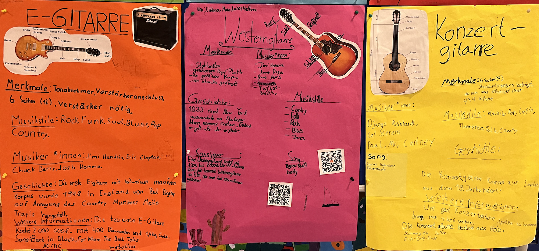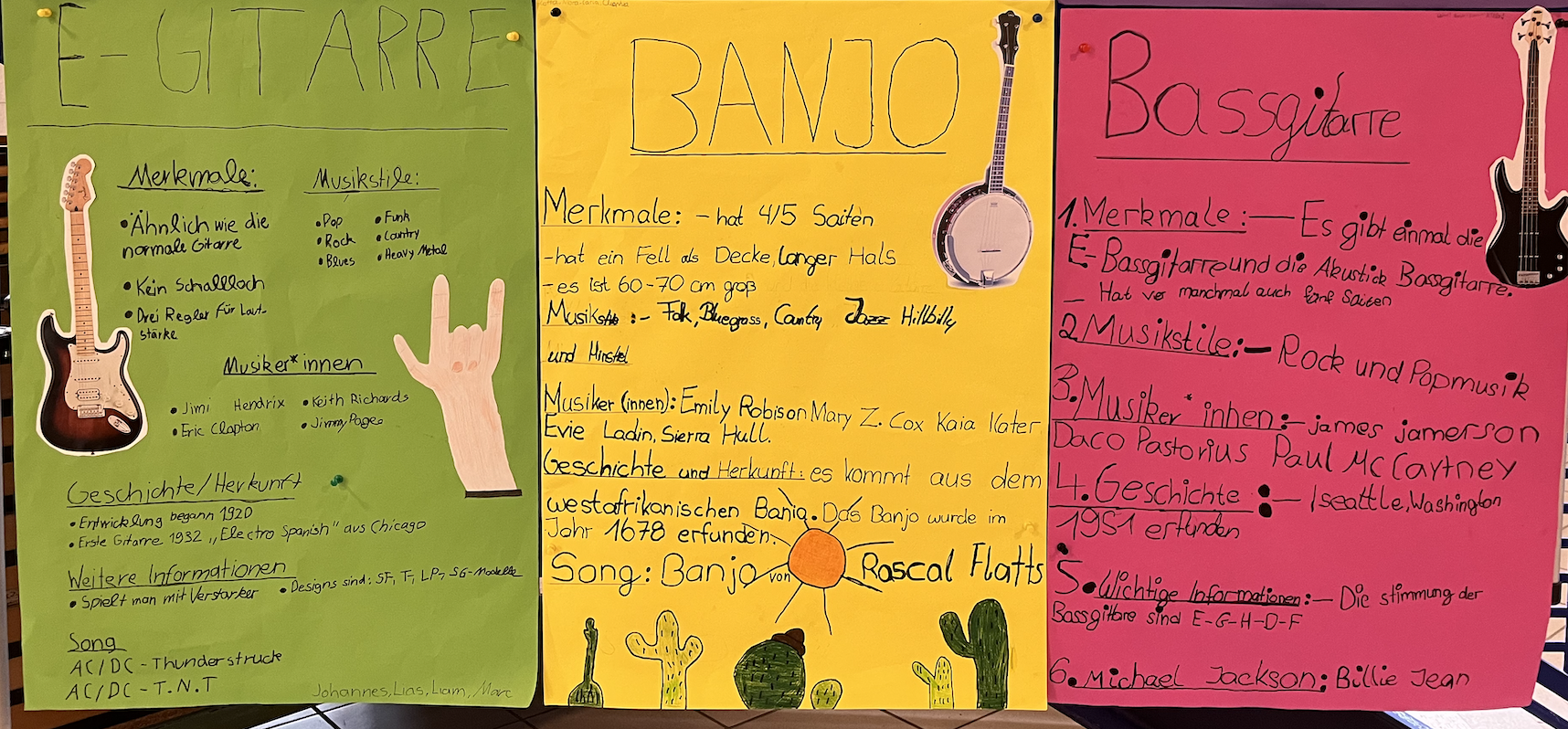 Im Musikunterricht haben sich die Klassen 4a und 4b mit verschiedenen Gitarrenarten beschäftigt. In kleinen Gruppen erforschten sie spannende Details zu unterschiedlichen Gitarren – von der klassischen Konzertgitarre bis zur E-Gitarre. Jede Gruppe gestaltete ein kreatives Plakat zu ihrer Gitarre und stellte es anschließend der eigenen Klasse vor.