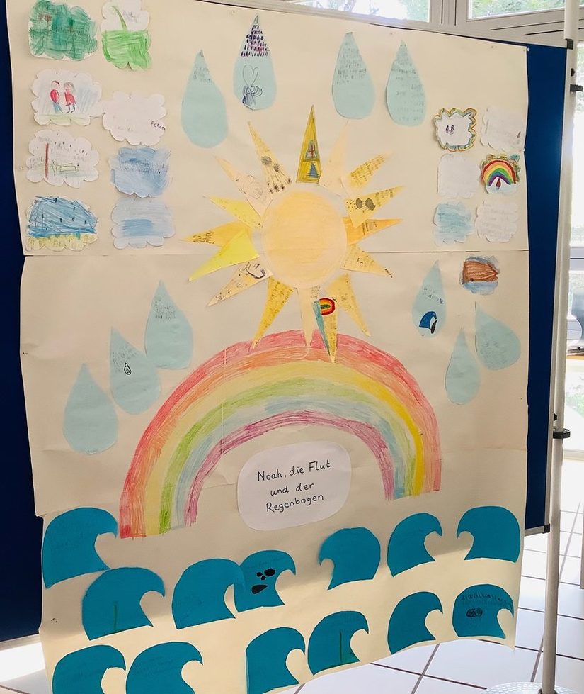 Die Zebraklasse stellte ein gemeinschaftlich erarbeitetes großes Plakat aus dem Religionsunterricht vor. Die Kinder hatten sich mit Gedanken, Wünschen und Hoffnungen von Noah und seiner Familie auseinandergesetzt.