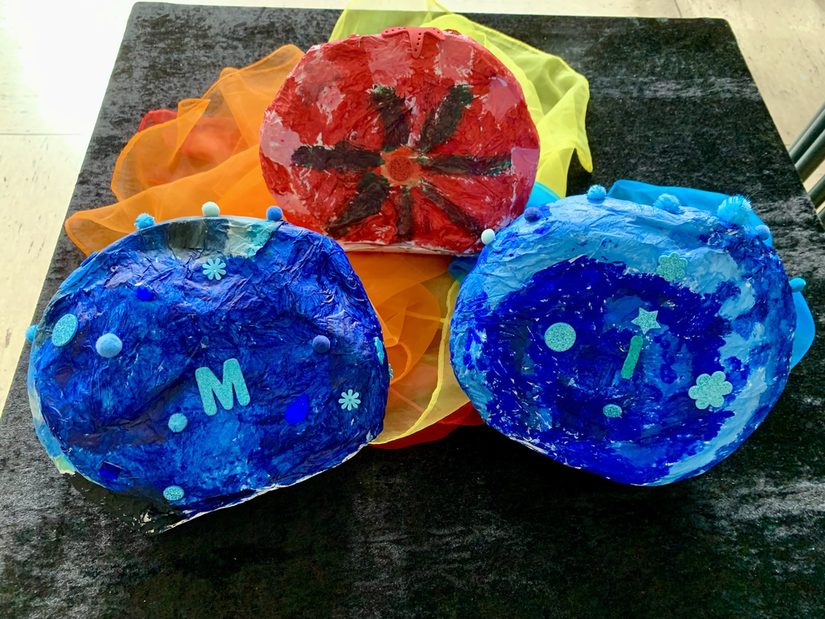 Die Dinoklasse führte einen Dinotanz mit selbstgebastelten Masken vor. Diese waren und er Karnevalszeit entstanden und warteten auf einen neuen Einsatz.