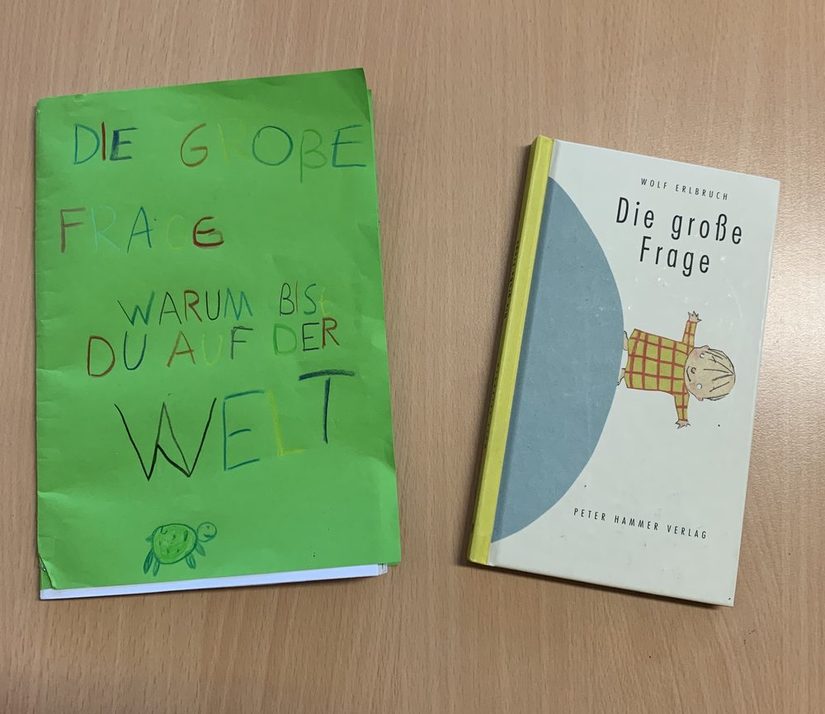 Als ersten Programmpunkt stellte die Schildkrötenklasse ihre Ergebnisse aus dem Religionsunterricht vor, in dem sie ein Projekt zu dem Buch "Die große Frage" durchgeführt hatte. Daraus entstand ein kleines Büchlein, bei dem von jedem Kind eine Seite zu der Frage gestaltet wurde: Warum bist du auf der Welt?"