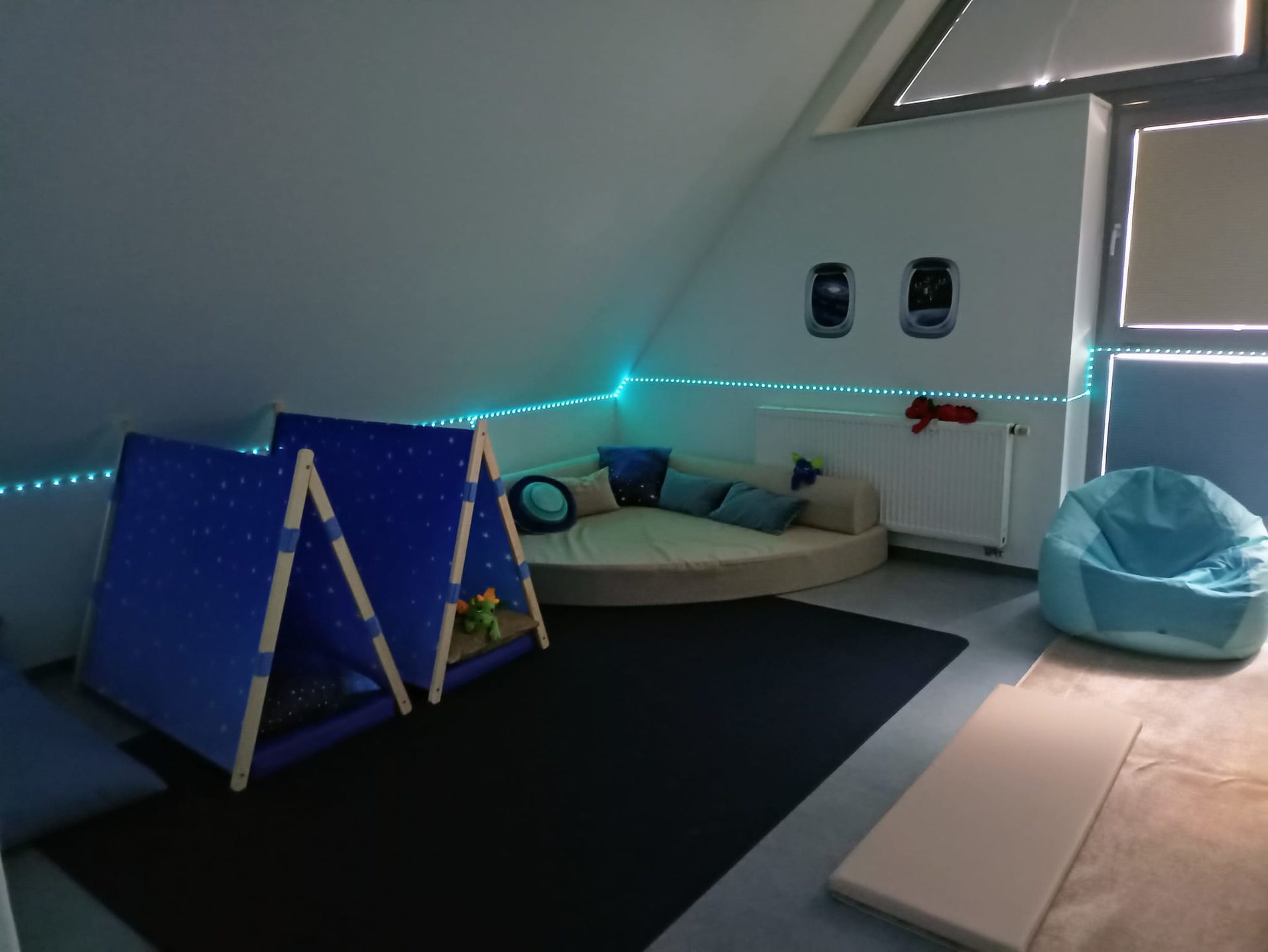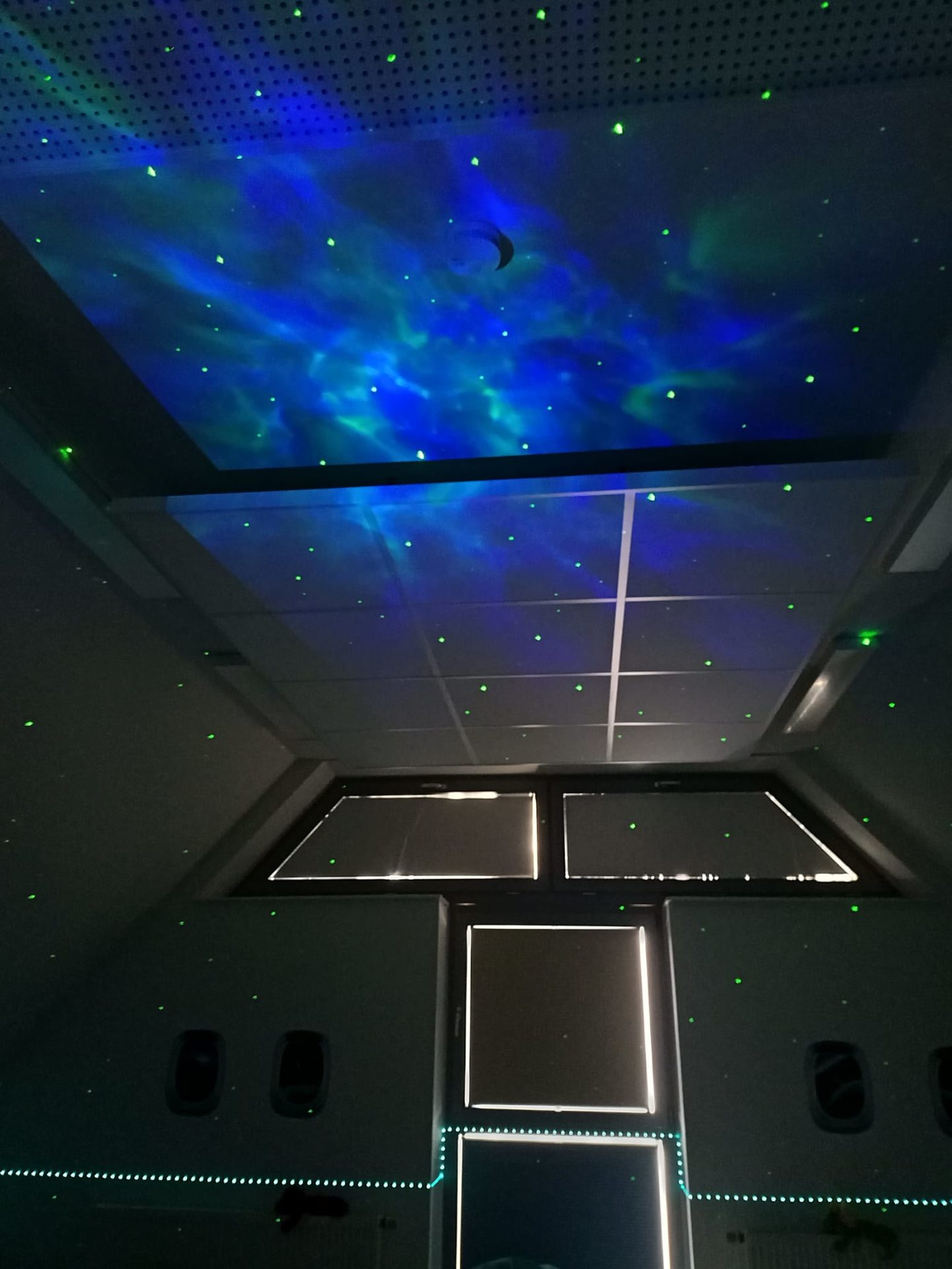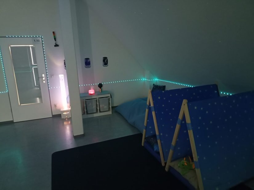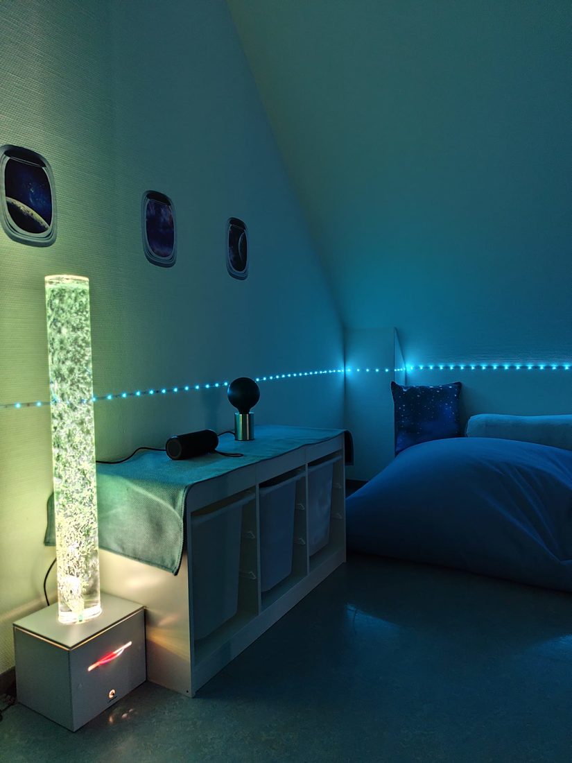 - Beleuchtung: Sanfte, dimmbare Lichtschläuche schaffen eine beruhigende Atmosphäre. Die Farbe und Intensität kann je nach Bedarf angepasst werden. Das Weltraum Thema kann auch durch die passende Beleuchtung unterstützt werden.