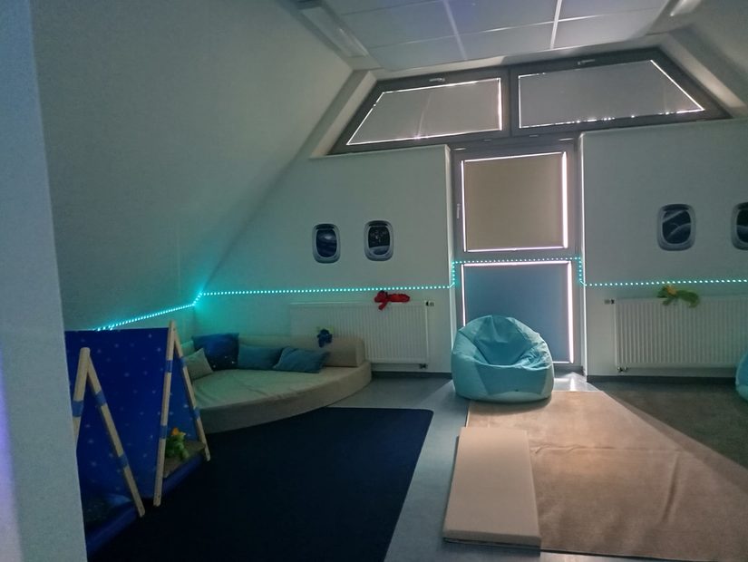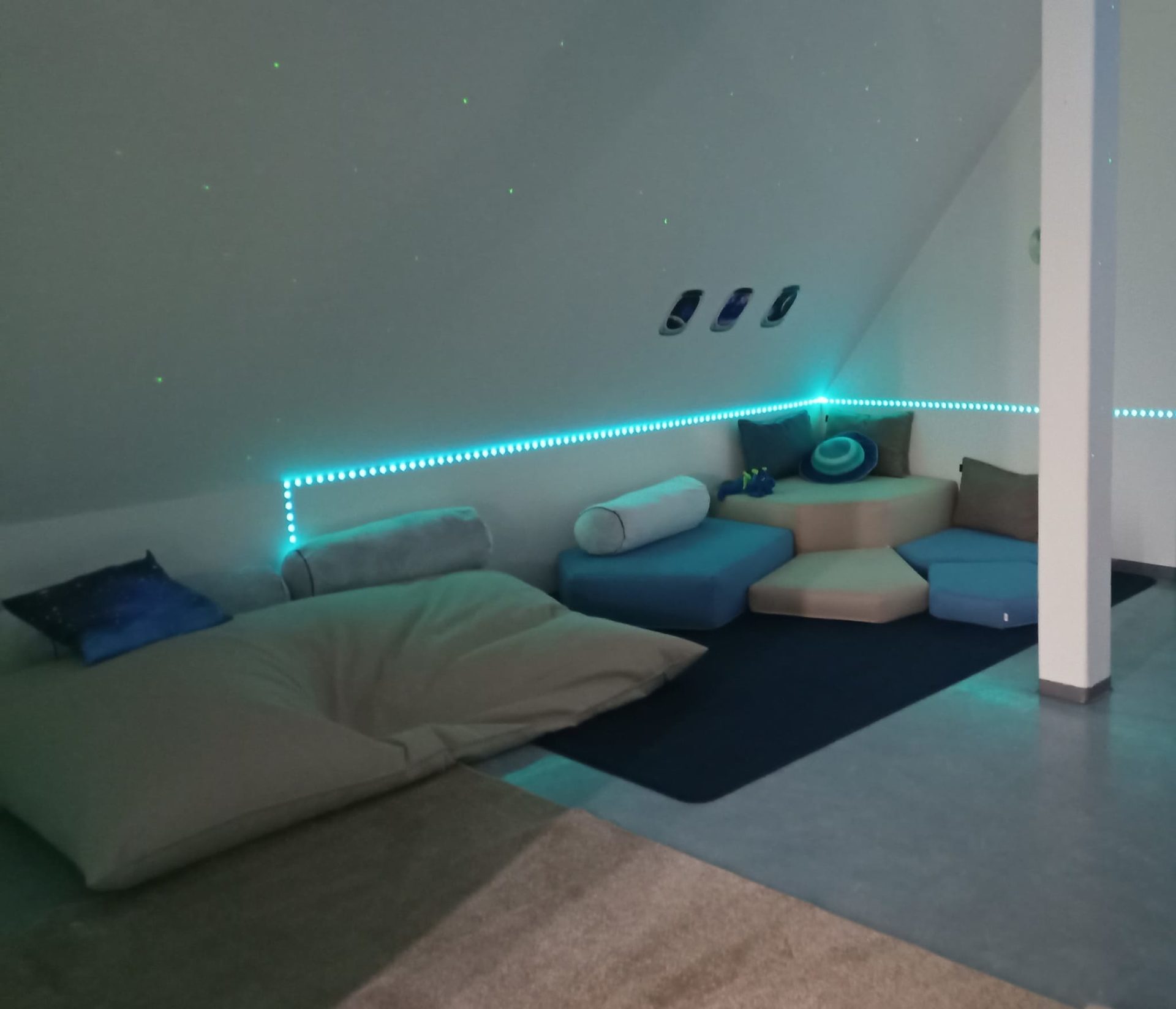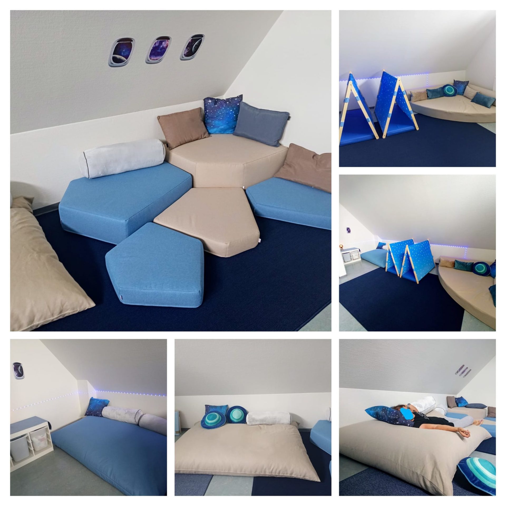 - Beleuchtung: Sanfte, dimmbare Lichtschläuche schaffen eine beruhigende Atmosphäre. Die Farbe und Intensität kann je nach Bedarf angepasst werden. Das Weltraum Thema kann auch durch die passende Beleuchtung unterstützt werden.