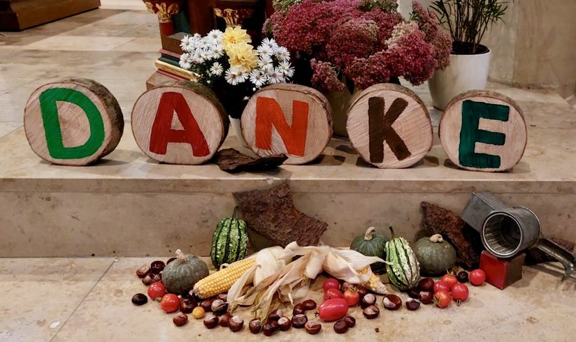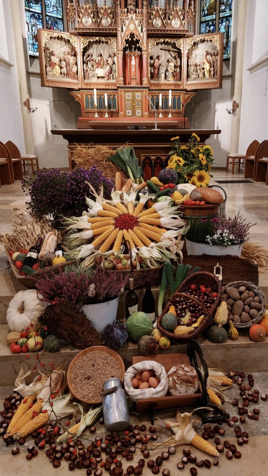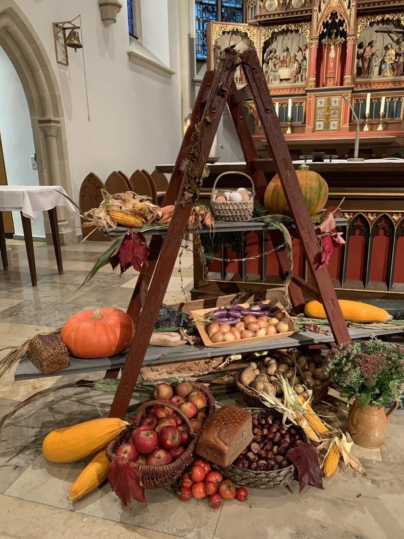 Der Altar war liebevoll mit buntem Obst, Gemüse und Getreide geschmückt. Zum Schluss sprach Pastor Rasche den Segen und wünschte uns, dass wir dankbar und fröhlich durchs Leben gehen und das Gute mit anderen teilen.