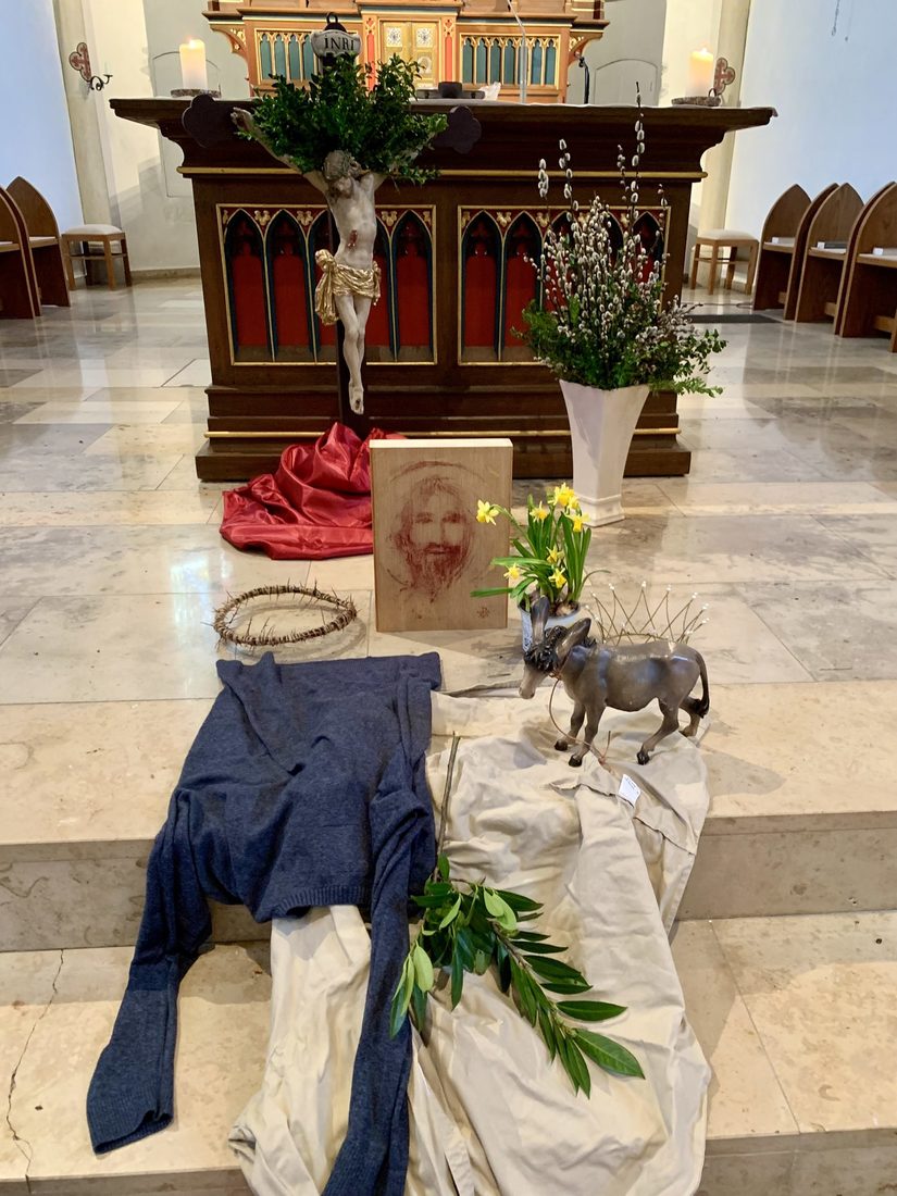 Dies wurde erreicht durch die symbolische Nachstellung des Weges Jesu in der Karwoche unter Einbezug der Schülerinnen und Schüler. Gemeinsam mit Pastor Becker legten sie mit verschiedenen Gegenständen Stationen dieses Weges nach - von Jesu Einzug in Jerusalem bis hin zu seiner Kreuzigung und Auferstehung.