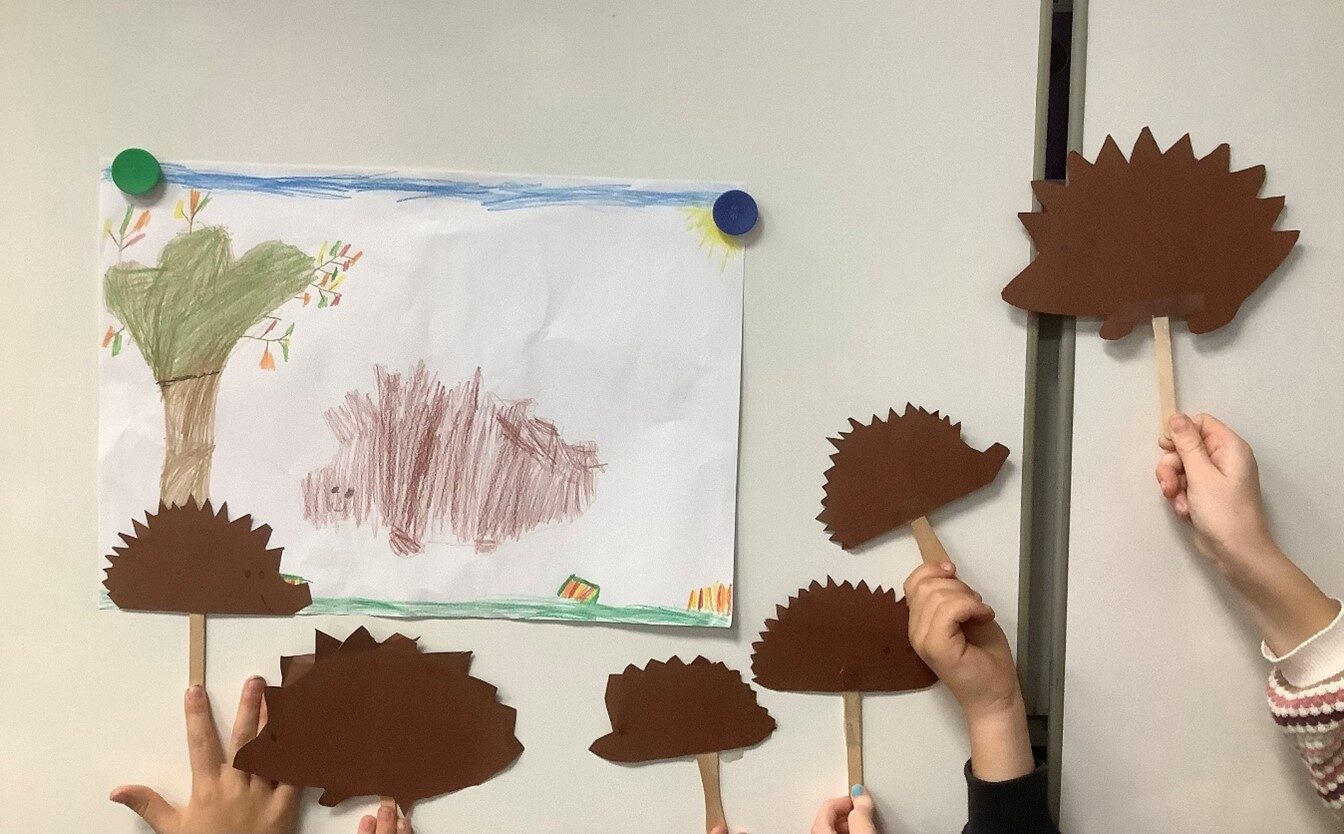 Erst haben wir unser Wissen über Igel ausgetauscht und uns in einem Sachbuch und einem Film über Igel informiert. Danach haben wir in Gruppen gearbeitet. Jede Vierergruppe hat sich etwas überlegt, was sie der ganzen Klasse über Igel erzählen, zeigen oder vorführen möchte.