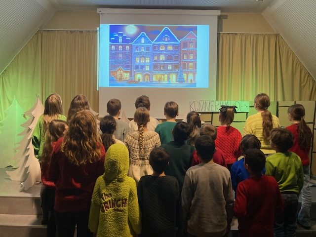 Nicht so die Bürgermeisterin der kleinen Stadt ‚Kummerwalde‘. Sie kann Weihnachten einfach nicht mehr hören, möchte ihre Ruhe und fühlt sich durch die hellen Kinderstimmen schrecklich gestört. Dass man aber auch solche Weihnachtsmuffel durch wunderschöne Lieder wieder zum Strahlen bringen kann, darum ging es in dem Mini Weihnachtsmusical der Klasse 4b.