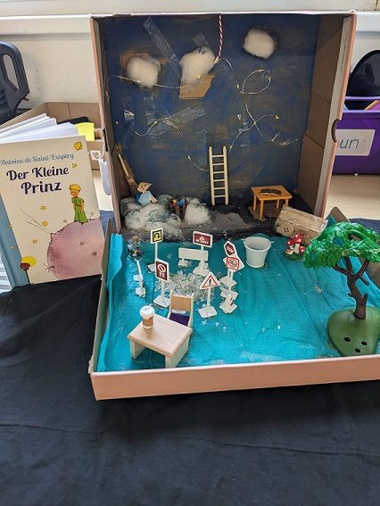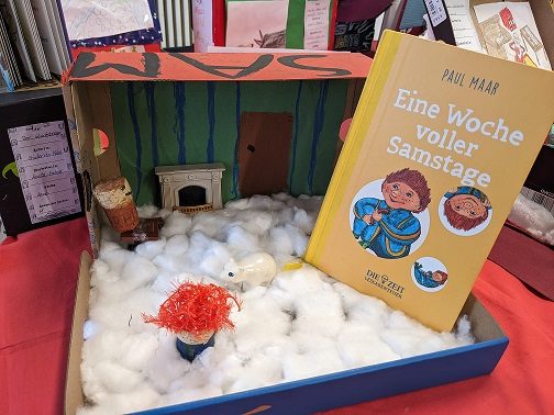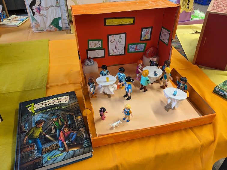 Die Kinder des 3. Jahrgangs nehmen uns mit in die Welt ihrer Lieblingsgeschichten. Im Rahmen eines Buchprojekts haben sie sich im Deutsch- und Kunstunterricht intensiv mit ihren selbst ausgewählten Büchern auseinandergesetzt und unter anderem Steckbriefe zu ihren Lektüren erstellt oder Postkarten an ihre Lieblingsfiguren geschrieben. Die Kinder haben Schuhkartons mit Gegenständen gestaltet, die sie gesammelt und gebastelt haben und mit denen sie den Inhalt ihrer Bücher darstellen konnten. Nachdem sie den Mitschüler*innen ihrer Klassen die Bücher und Lesekisten präsentiert haben, wurden diese im Kunstraum der Schule ausgestellt.
