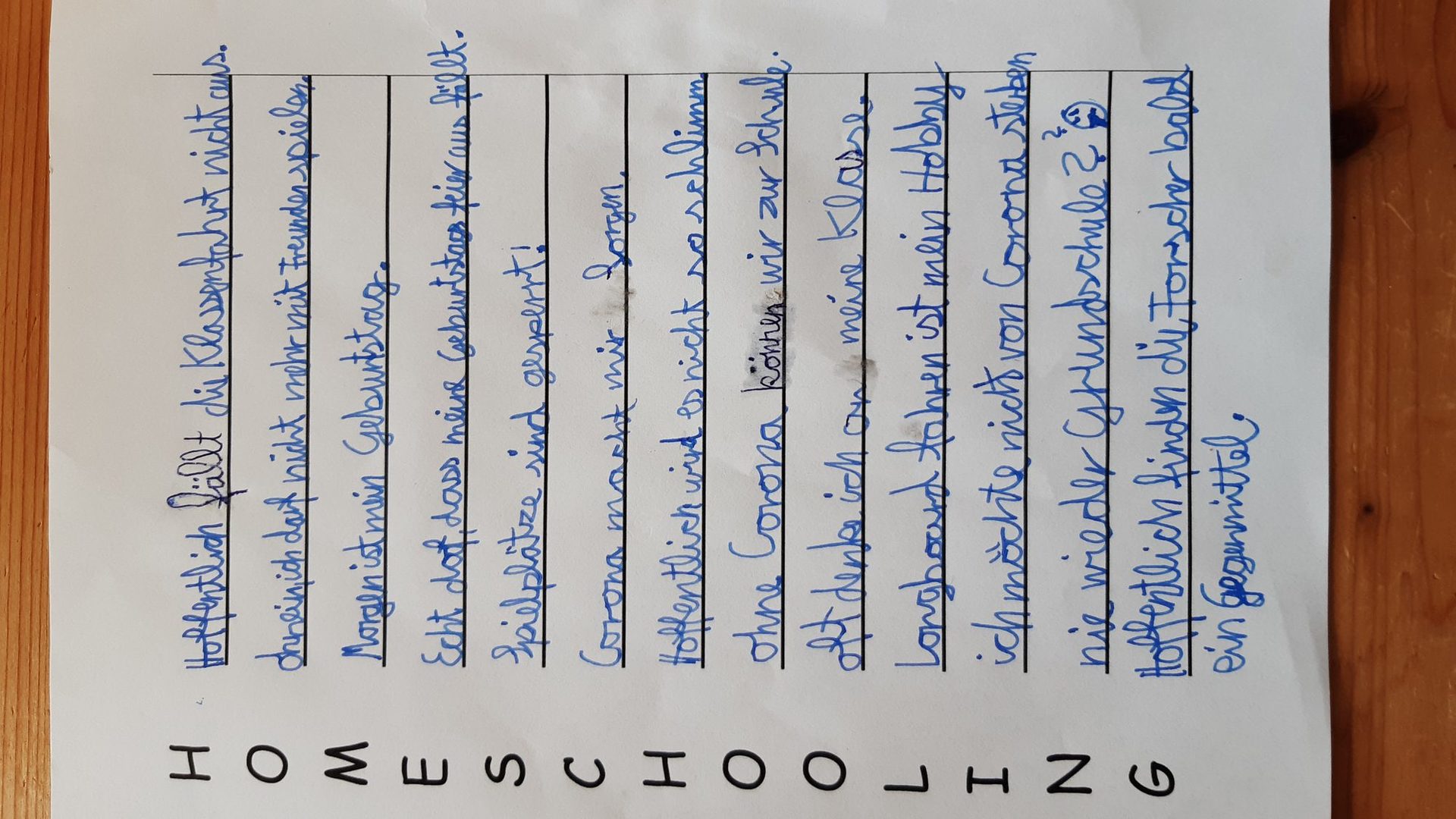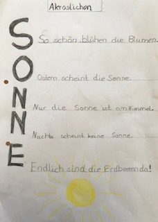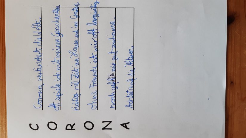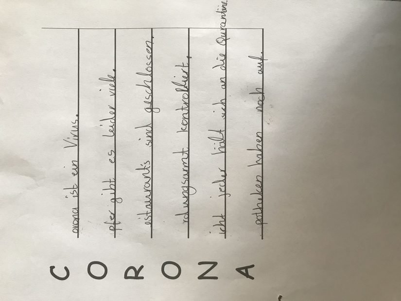 Seit dem 16.03.2020 lernen die Schüler nun zuhause. Viele Kinder haben ihren Lehrerinnen Briefe geschrieben. Einige Kinder der Klasse 4a haben ein Akrostichon zur Coronazeit verfasst.