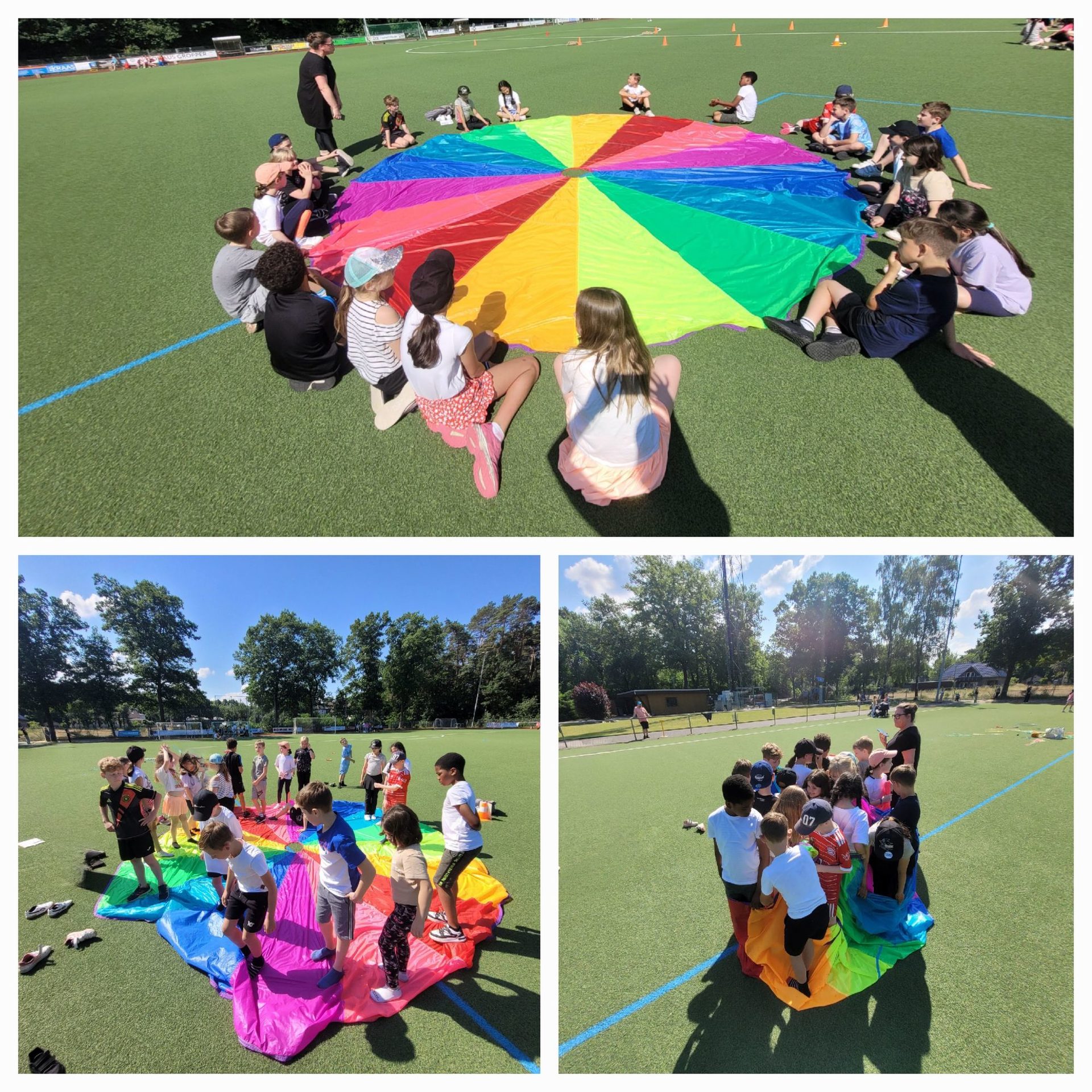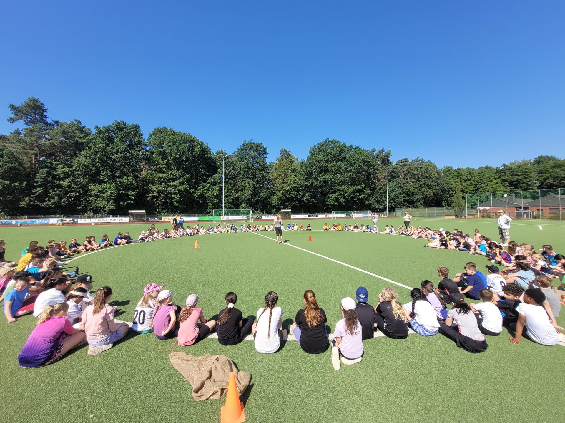 Am 24.06.24 fand unser diesjähriges Sportfest für alle Schülerinnen und Schüler der GGS Thune auf dem naheliegenden Sportplatz statt. Gemeinsam in einem großen Kreis und mit Musik, wärmten sich alle Kinder zu Beginn für das Sportfest auf. Bei schönstem Sommerwetter durchliefen die einzelnen Schulklassen Stationen mit unterschiedlichen Disziplinen. Weitwurf mit Sandsäcken, Weitsprung, ein Staffellauf mit kleinen Hürden, ein Ausdauerlauf, aber auch ein Kooperationsspiel auf einem Tuch, das als Team einmal "umgedreht" werden musste ohne den Rasen zu berühren, standen u.a. auf dem Programmpunkt. Zwischendurch gab es kleine Pausen, in denen sich kurz erholt werden konnte.