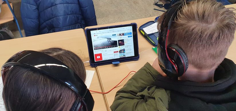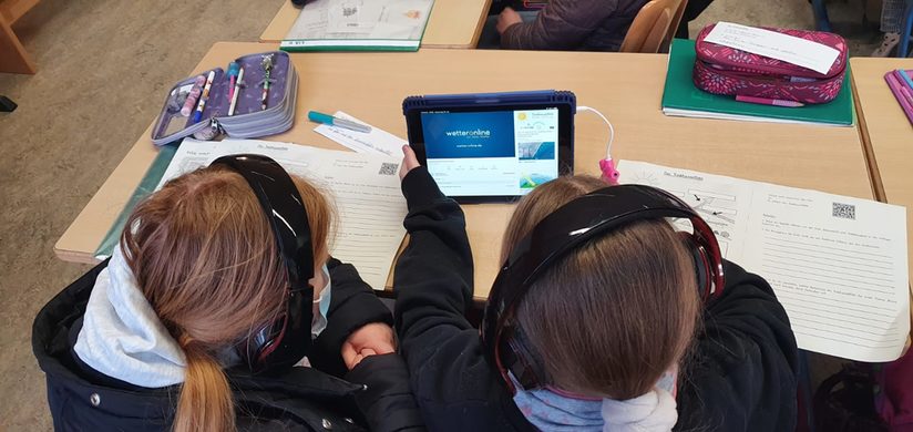 So arbeitet die Klasse 4c (hier bei der Arbeit zum Thema „Klima im Wandel“ zu sehen) momentan mit einem PDF- Dokument, in welchem die Lernenden zwischen unterschiedlichen Informationen selbstständig und themenbezogen navigieren können. Darüber hinaus werden ausgewählte Erklärvideos gezielt in den Unterricht einbezogen. Die Nutzung unserer Kopfhörer sorgt dabei für den nötigen Fokus.