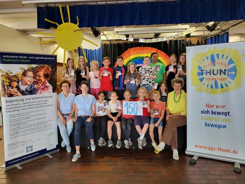 Auch in diesem Sommer 2023 führten musicalbegeisterte Grundschulkinder aus den vierten Klassen wieder ein Musical auf: Dieses Mal Das tapfere Schneiderlein auf dem Programm. Unter der Leitung von Beate Wiethoff gab es insgesamt sogar fünf Aufführungen. Bei der öffentlichen Veranstaltung spendete das jubelnde Publikum im Anschluss 150 €. Die Kinder entschlossen sich, die gesamte Summe an den Kinderhospiz-Verein Paderborn- Höxter zu spenden. Die Kinder zeigten sich froh über viele schöne Probenmomente, ihre Erfolge und die unvergesslichen Aufführungen. Mit großer Freude über die große Spendenbereitschaft überreichten sie den Scheck, der dankbar entgegengenommen wurde. Nun freuen sich schon alle auf das neue Musical im kommenden Schuljahr!