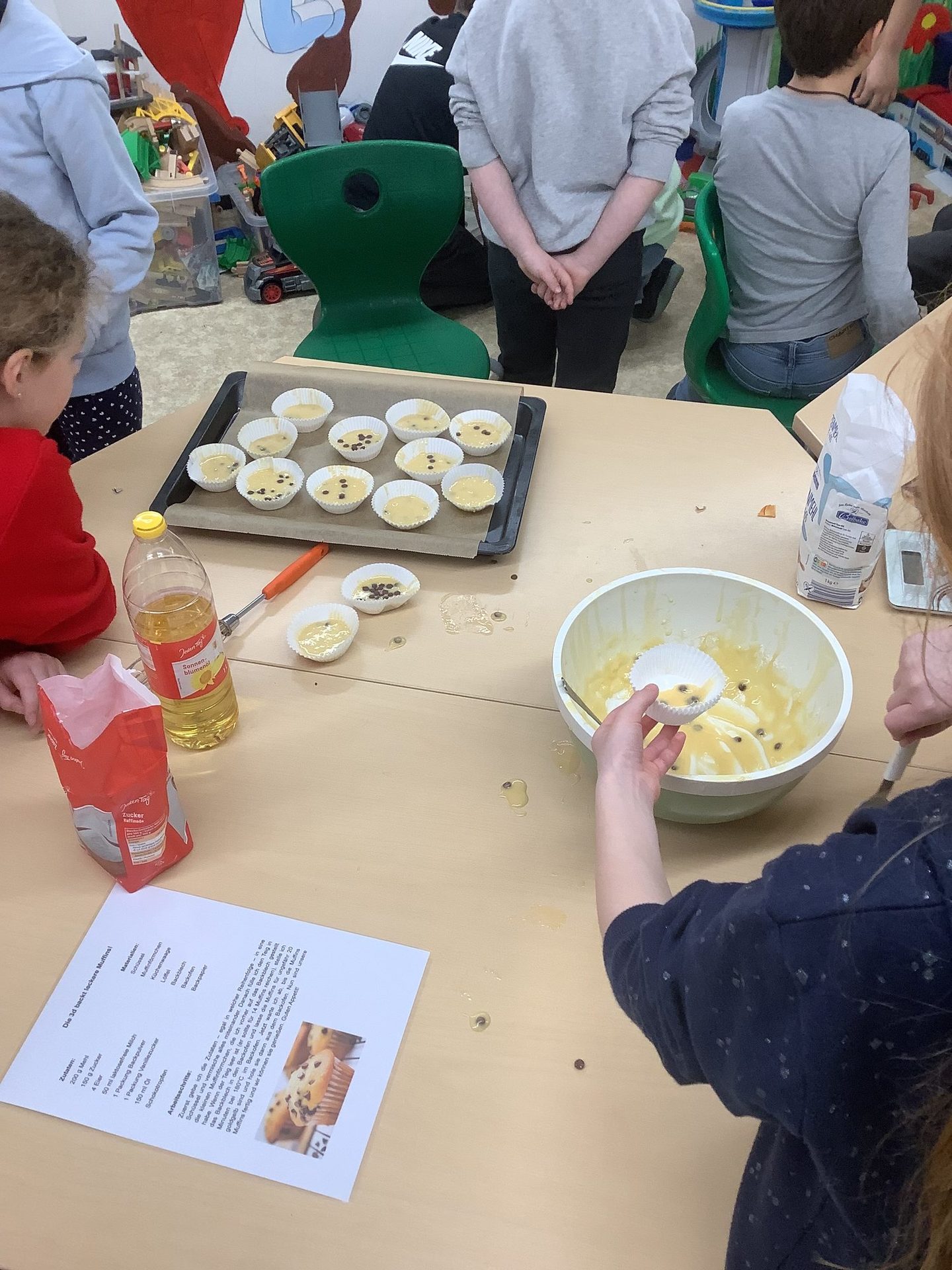 Der Duft der frisch gebackenen Muffins erfüllte schließlich den Raum und belohnte alle für ihre Mühe. Natürlich durfte auch das gemeinsame Probieren nicht fehlen. Die Aktion machte allen großen Spaß und war ein gelungener, leckerer Abschluss des Themas.