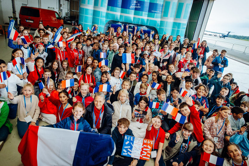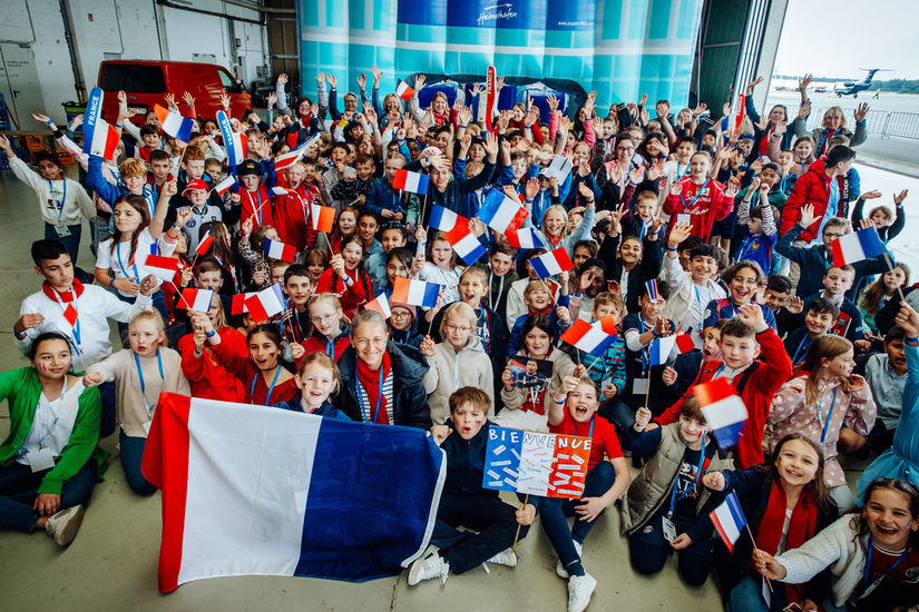 Wir haben uns alle sehr gefreut, die Fußballstars zu sehen. Um sie gebührend zu empfangen, waren wir Kinder und unsere Lehrerinnen in den Farben Frankreichs – blau, weiß und rot – gekleidet. Eine Kapelle hat sogar die Nationalhymnen von Frankreich, Deutschland und Europa gespielt. Das war wirklich cool! Und das Beste: Wir haben alle mitgesungen. Das hatten wir im Unterricht lange geübt und wir waren ganz stolz, wie toll das geklappt hat. Viele von uns hatten kleine Fähnchen in der Hand und haben damit gewedelt – die deutschen und französischen Fähnchen sahen zusammen richtig schön aus.