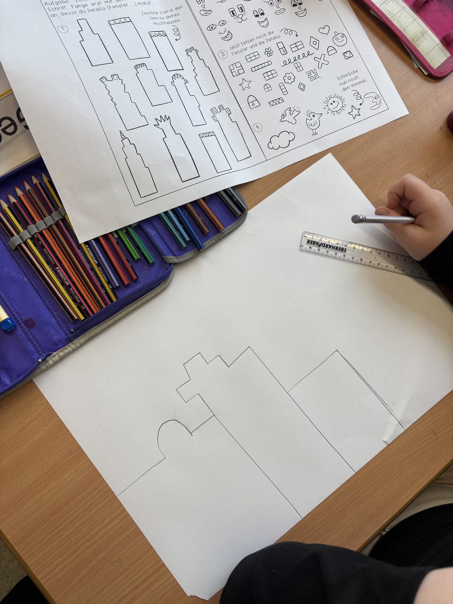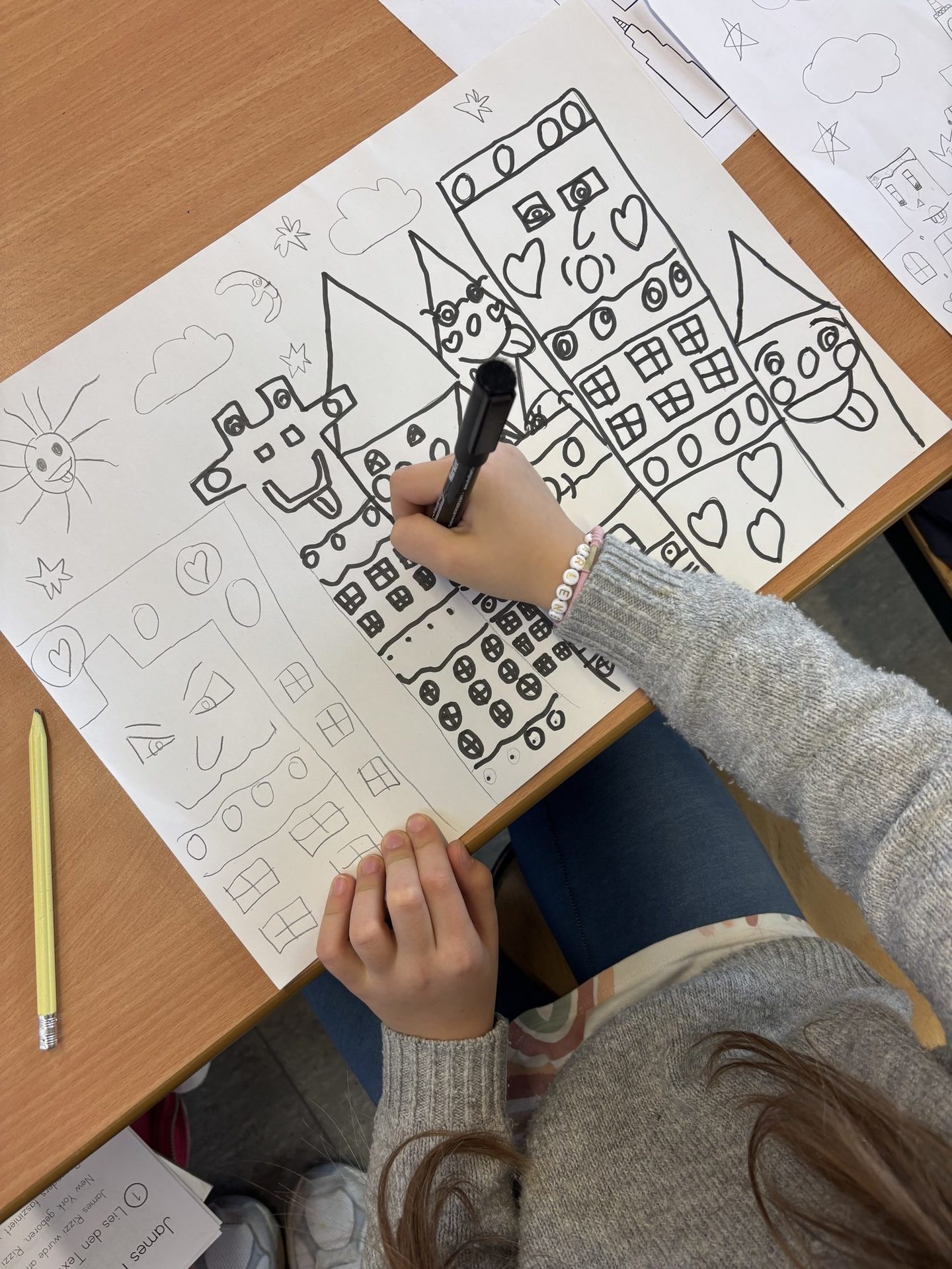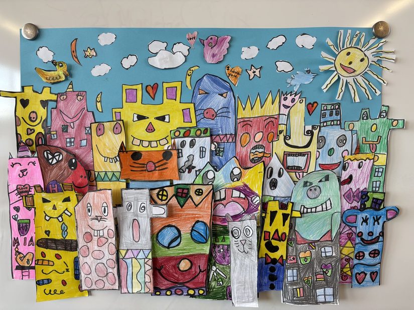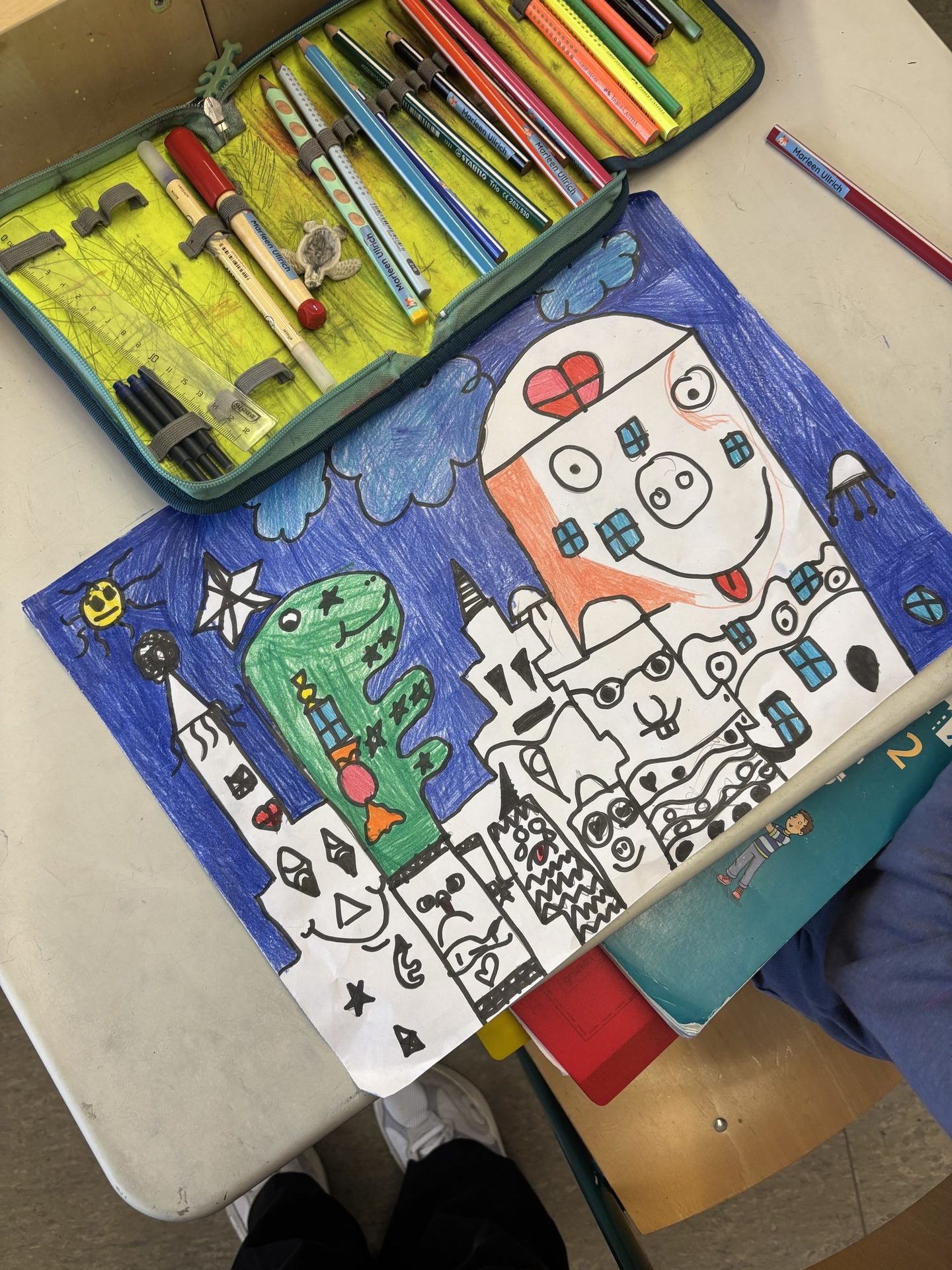 Anschließend wurden sie selbst kreativ: Mit leuchtenden Farben, verspielten Formen und fröhlichen Stadtmotiven haben sie eigene Kunstwerke gestaltet – inspiriert von Rizziseinzigartigem Stil. Der krönende Abschluss des Projekts war ein großes Gemeinschaftsbild mit 3D-Effekt, bei dem verschiedene Werke zu einem beeindruckenden Gesamtkunstwerk zusammengefügt wurden.
