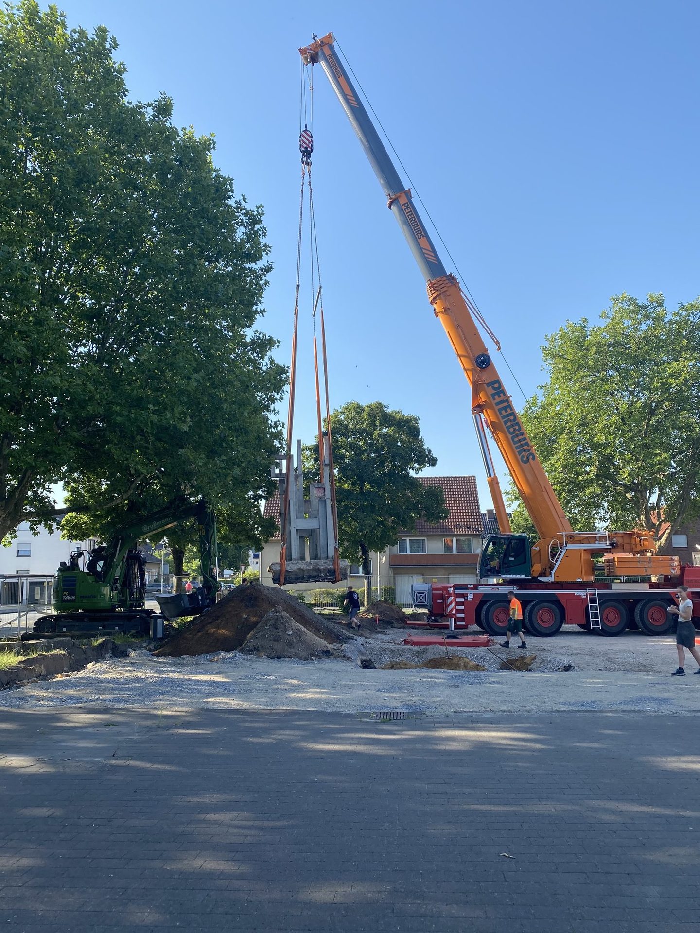Am 02.07.2025 ist auf unserem Schulhof etwas richtig Spannendes passiert: Ein riesiger Kran kam und hat das große Kunstwerk von Josef Rikus versetzt! Das musste gemacht werden, weil an der Stelle, wo es vorher stand, bald unser neuer Schulbau entsteht.