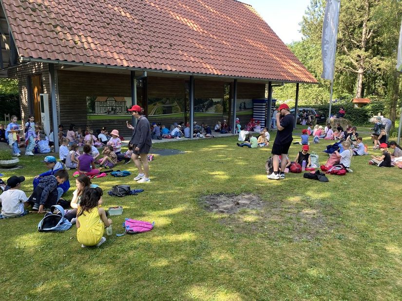 Unser Ziel war der große Spielplatz an den Emsquellen. Dort gab es alles, was man sich wünschen kann: Wasserspielplatz, Schaukeln, eine Seilbahn und viele schattige Plätze zum Ausruhen. Leider hatte der 4. Jahrgang eine andere Route und konnte nicht mehr zum Spielplatz kommen – das war ein bisschen schade.