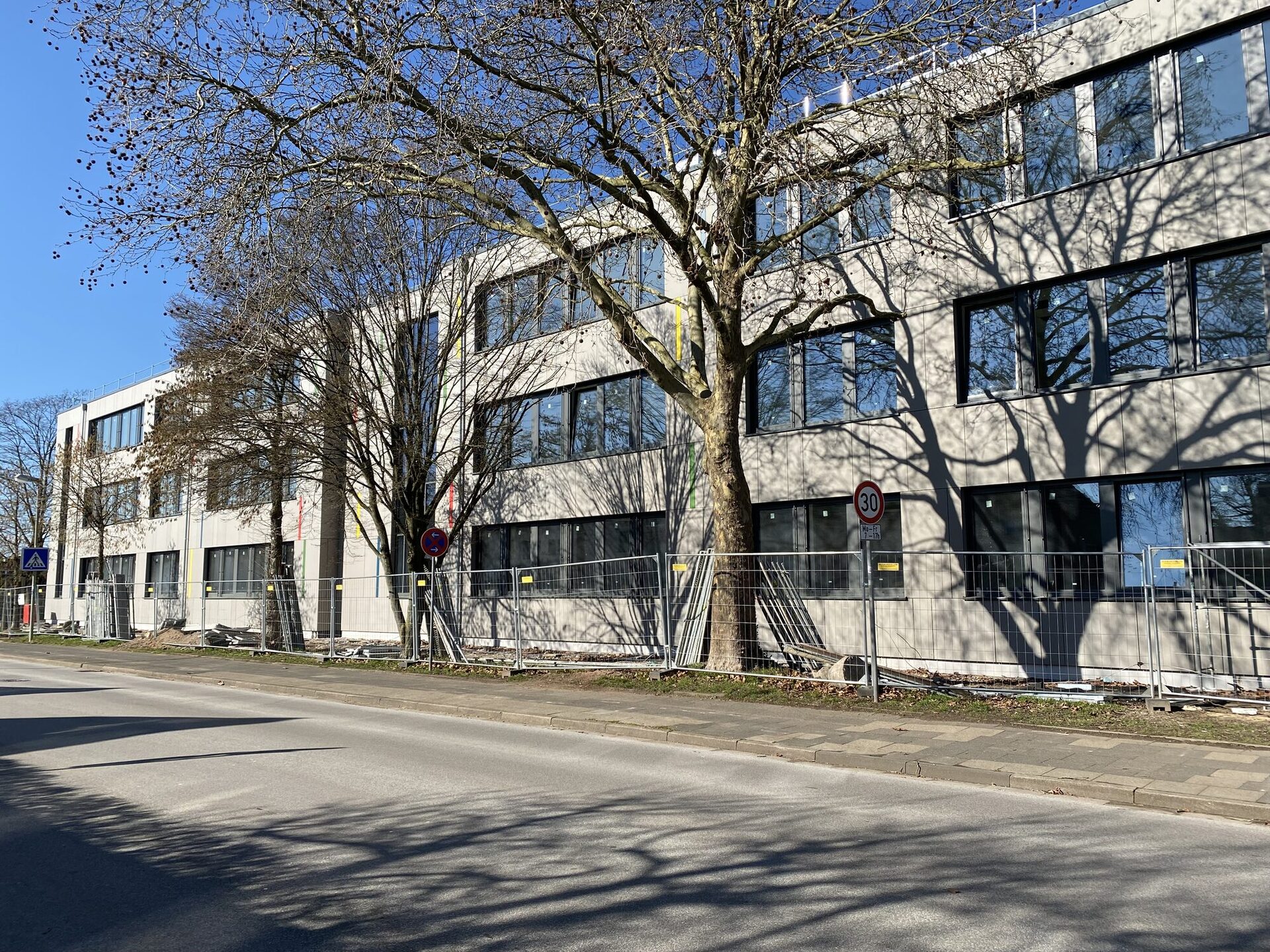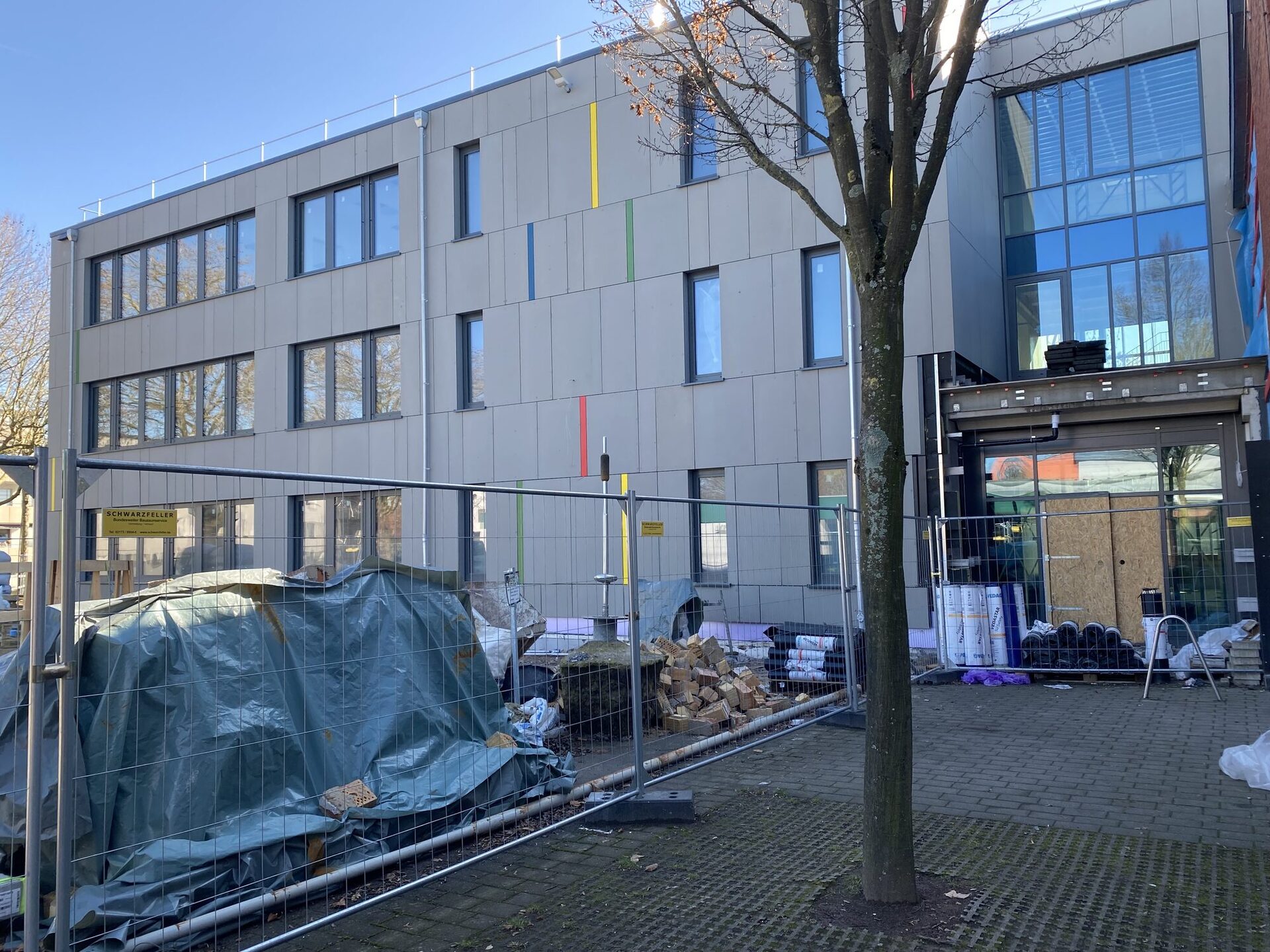 Damit zeigt sich das Gebäude nun erstmals in seiner endgültigen Gestaltung. Die moderne Fassadenverkleidung, die großen Fensterflächen und die farbigen Akzente des Schullogos prägen das Erscheinungsbild und verleihen dem Neubau eine freundliche und zeitgemäße Wirkung.