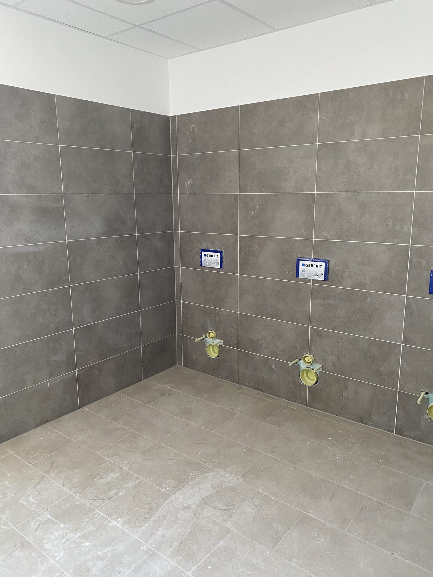 In einigen Räumen ist bereits gut zu erkennen, wie die zukünftigen Klassen- und Arbeitsräume aussehen werden. Gleichzeitig schreiten auch die Arbeiten in den Sanitärbereichen voran: Die Fliesen sind größtenteils verlegt und die Anschlüsse für die sanitären Anlagen vorbereitet.