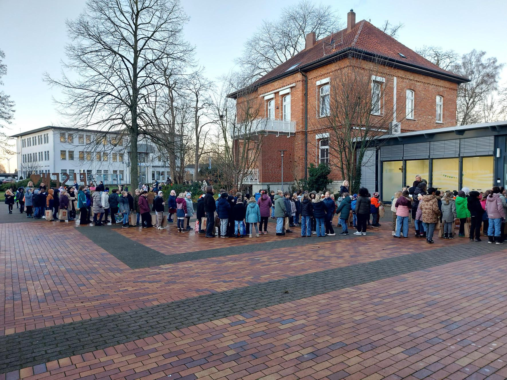 Nach dem Adventssingen machten sich die Klassen auf den Weg zum Dionysiushaus und wurden dort von MitarbeiterInnen der Tafel empfangen. Es wurden sehr viele Kisten voll gepackt und so konnten wir bestimmt einigen Familien helfen.