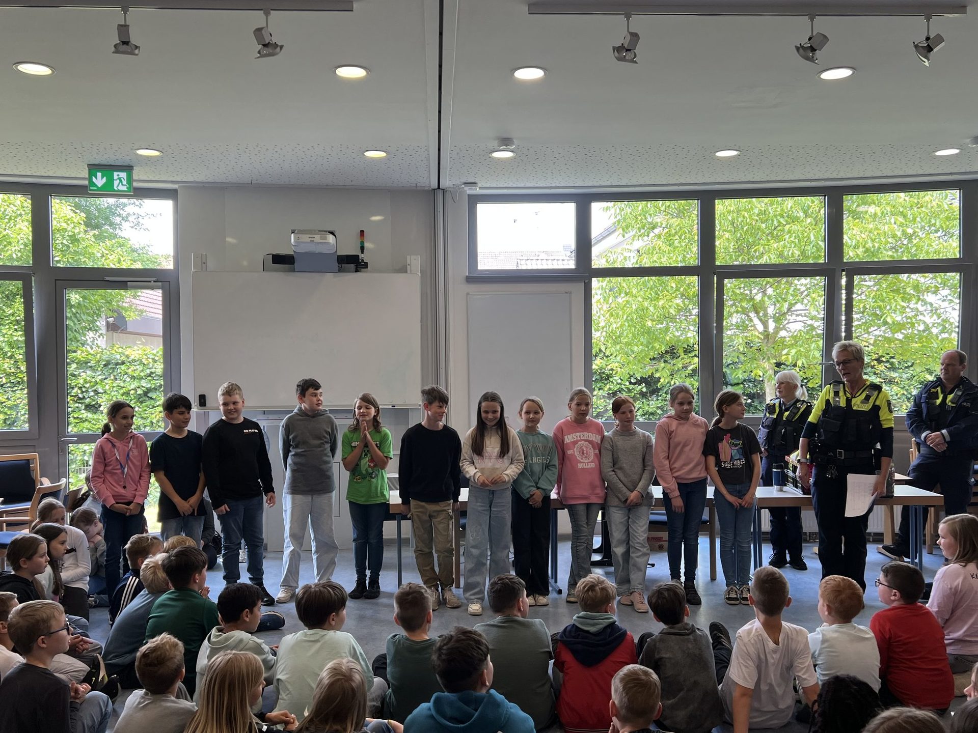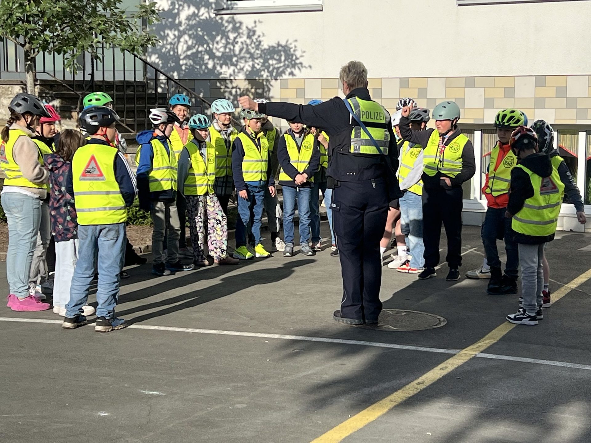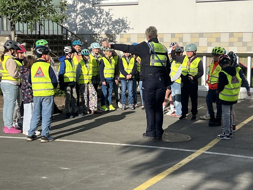 Zuerst musste aber ganz viel geübt werden. Das haben wir zuerst auf dem Schulhof auf unserer aufgemalten Straße und danach mit der Polizei und Eltern im Straßenverkehr auf insgesamt drei Übungsstrecken gemacht.