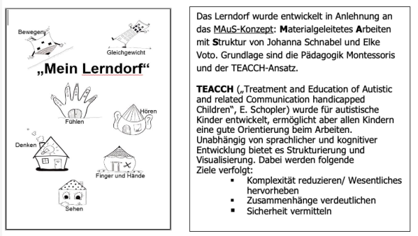 Im Rahmen des Maus-Konzeptes bietet das Lerndorf gute Möglichkeiten zur Individualisierung und Differenzierung durch die Berücksichtigung von individuellen Stärken und Defiziten, Lerntypen, Arbeitstempo, Ausdauer, Wahrnehmung, Konzen-tration, Arbeitstechniken, Selbstständigkeit und Denkfähigkeit.