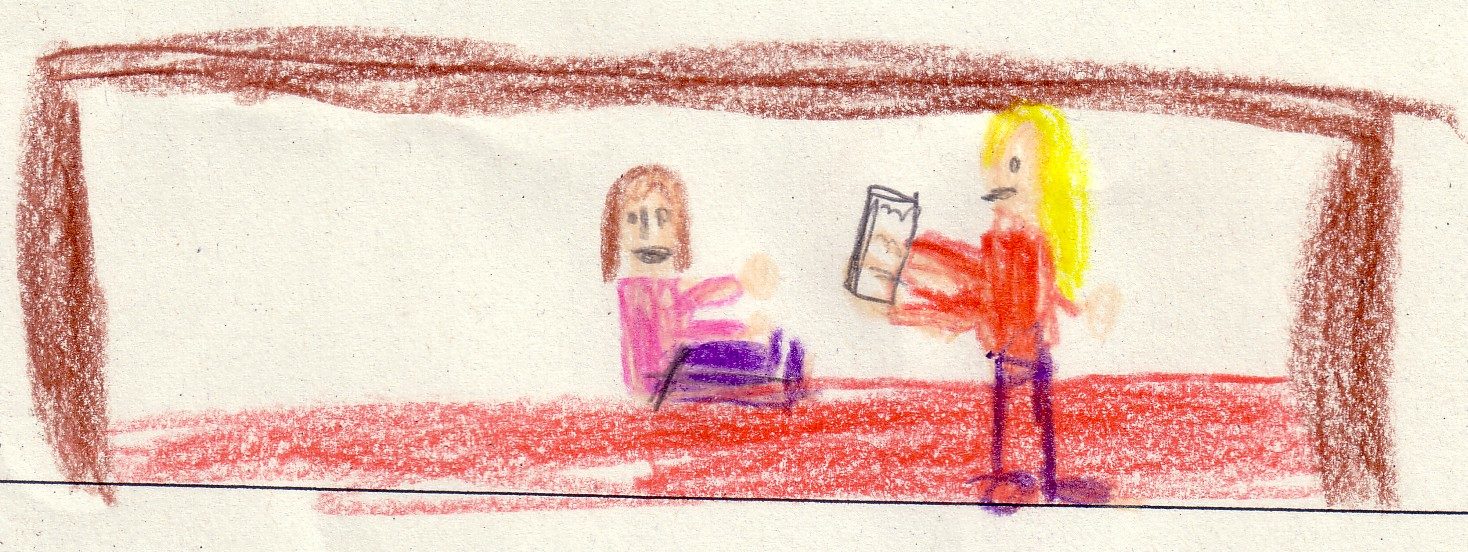 Wir waren im Kindergarten. Da habe ich Marie ein Buch vorgelesen es hieß, der Mathemuffel. Ich wollte nur vier Seiten lesen, aber ich habe mehr gelesen. Und danach war ich müde. Und wir sind raus gegangen.(Leonie)