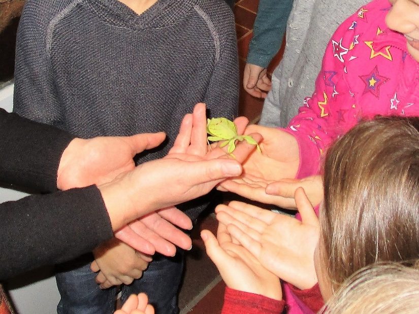 Das ist Charly – das Chamäleon, das zurzeit im Naturkundemuseum in einem Terrarium lebt. Manche Tiere sind durch Färbung und Körperbau perfekt an ihren Lebensraum angepasst und so gut getarnt, dass man sie nur sehr schwer entdecken kann. Wir mussten ziemlich genau hinschauen, bevor wir das Tier im Blättergewirr entdecken konnten. Dann hat der Leiter des Museums Charly gefüttert. Er hat eine ziemlich lange Zunge, die super schnell aus seinem Maul herausschnellte, um die Beute zu fangen. Auch die Stabheu-schrecke oder das Wandelnde Blatt war im Terrarium schwer zu finden. Wir durften das Wandelnde Blatt sogar über unsere Hände laufen lassen. Das war ziemlich aufregend.