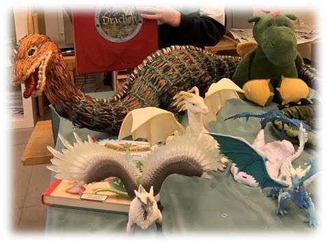 Die Geschichte des kleinen Raubdrachens, des alten Drachenlehrers und der Prinzessinnen Poppy und Caramella faszinierte die Kinder und alle tauchten in die Drachenwelt ein. Gemeinsam wurde in Drachenschrift geschrieben, Drachenlieder gesunden und eigene Drachen aus Ton geformt.