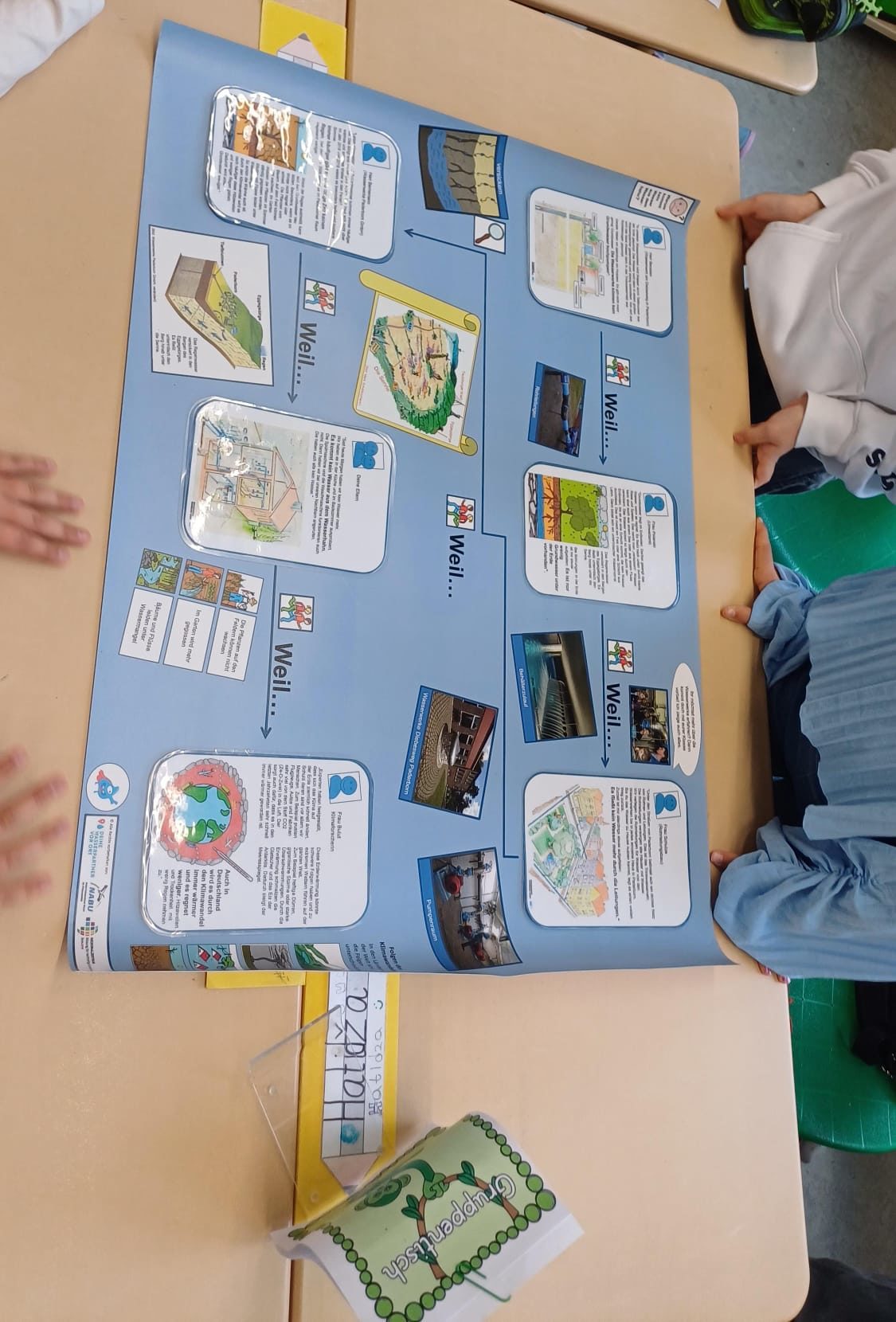 Am Vormittag des 9. Oktober 2025 nahmen die Klassen 4a und 4b einen interaktiven NABU-Projekttag rund um das Thema Wasser, Nachhaltigkeit und Klimawandel wahr. Ziel war es, den Wasserkreislauf zu verstehen, die Bedeutung von sauberem Trinkwasser zu erleben und gemeinsam zu entdecken, wie wir in Zeiten des Klimawandels nachhaltig und selbstwirksam handeln können. Durch interaktive Spiele, das gemeinsame Legen von Bodenbildern sowie die Durchführung eines Quiz innerhalb von Kleingruppen lernten wir einiges über den Wasserkreislauf, die Bedeutung von Trinkwasser und den Einfluss des Klimawandels und hatten dabei Spaß in der gemeinsamen Teamarbeit.