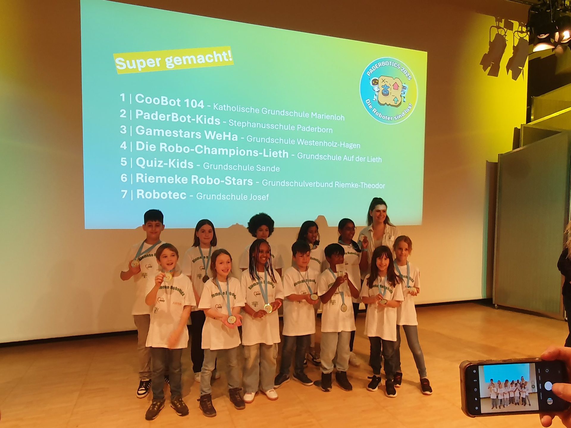 Die Riemeke Robo-Kids von der OGS vom Riemekestandort sind bei ihrer ersten Teilnahme beim Paderbotic-Wettbewerb im HNF von der fachkundigen Jury auf Platz 1 gesetzt worden und bringen einen großen Pokal, Medaillen und Urkunden mit in die Schule. Aus 12 Schulen wurden Mannschaften gemeldet - aus 7 Schulen wurden fertige Apps fristgerecht abgegeben.
