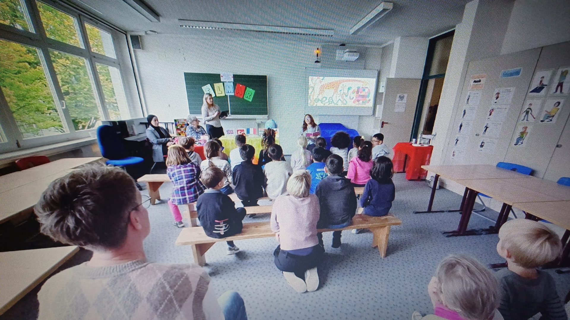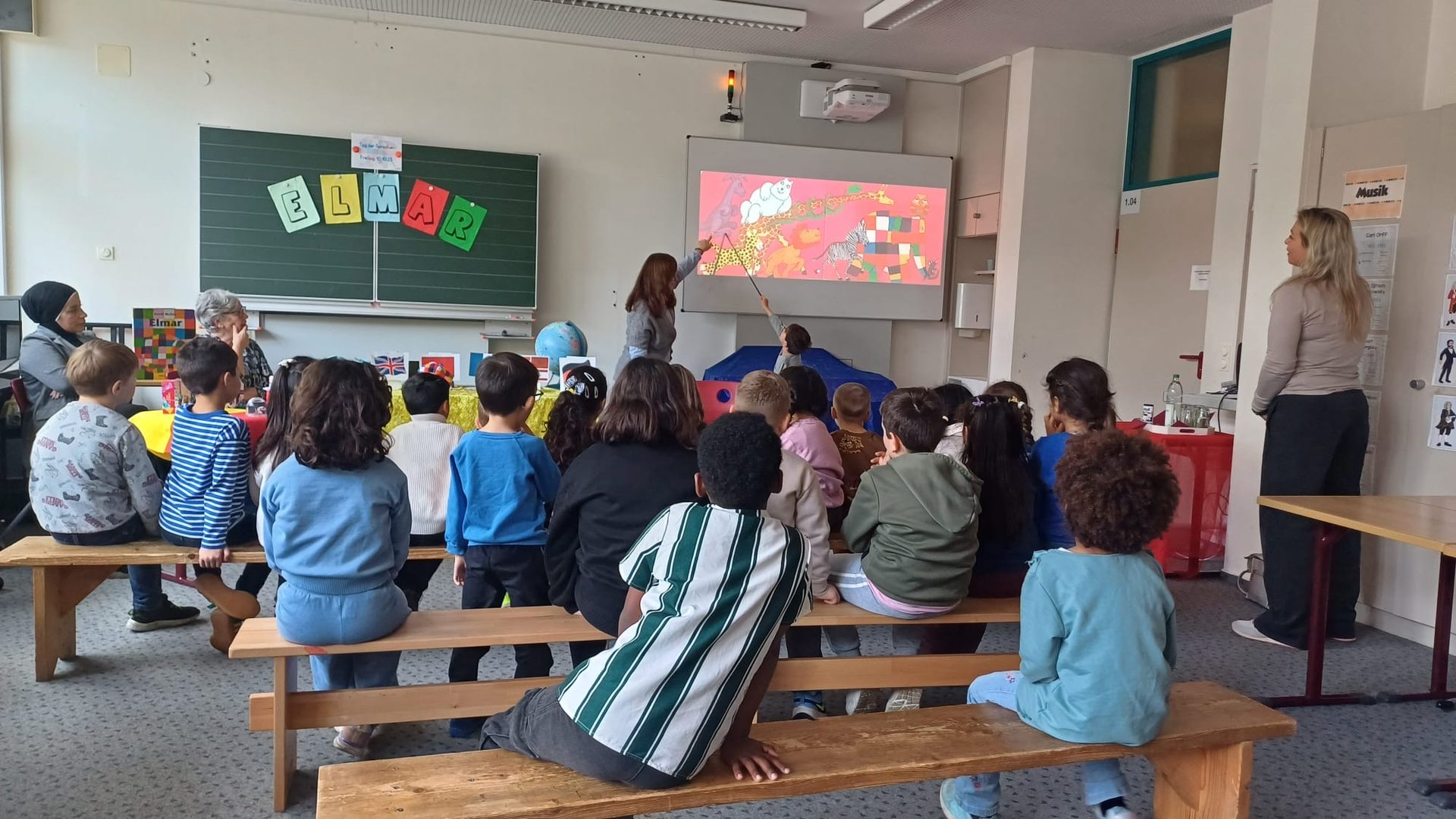 Im Rahmen des Europäischen Tags der Sprachen waren wir, die Kinder des 1. Schulbesuchsjahrs beider Schulstandorte am Freitag, den 10.10.2025 eingeladen, das Buch „Elmar und seine Freunde“ des Autors David McKee in verschiedenen Sprachen zu hören. Elmar, der bunt karierte Elefant, der auf seinem Spaziergang auf ganz verschiedene Tiere mit den unterschiedlichsten Begabungen trifft, die allesamt gleichermaßen zu Elmars Freundeskreis zählen. In Begleitung unserer Klassenlehrerinnen wurden wir im Musikraum am Riemekestandort von Frau Friesicke und den vier vorlesenden Gästen empfangen. Es folgten Lesevorträge des englisch-, arabisch-, türkisch- sowie französischsprachigen Kinderbuchs durch einen Schüler der Klasse 4b, unserer Praxissemesterstudentin sowie durch zwei Elternvertreterinnen, die über unsere Projektinitiative „Rucksack Schule“ gewonnen werden konnten. Unsere ehrenamtlich tätige Bibliothekarin, Frau Krenz, öffnete schließlich den letzten Sprachschatz, indem sie die deutsche Version des beliebten Kinderbuchs vorlas. Gebannt folgten wir der Geschichte und dem Klang der verschiedenen Sprachen, entdeckten ähnlich klingende Wörter und lernten mit viel Freude sogar einzelne Wörter der vorgetragenen Sprachen. Auf der großen Projektionsfläche des Whiteboards bestaunten wir die farbenfrohen Bilder des Buchs in voller Größe.