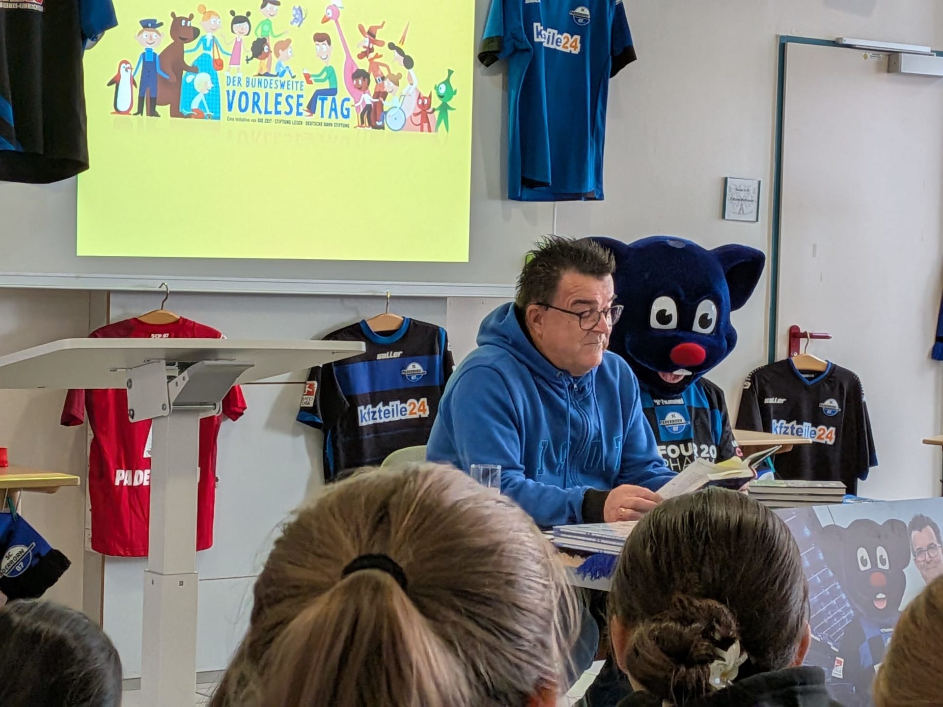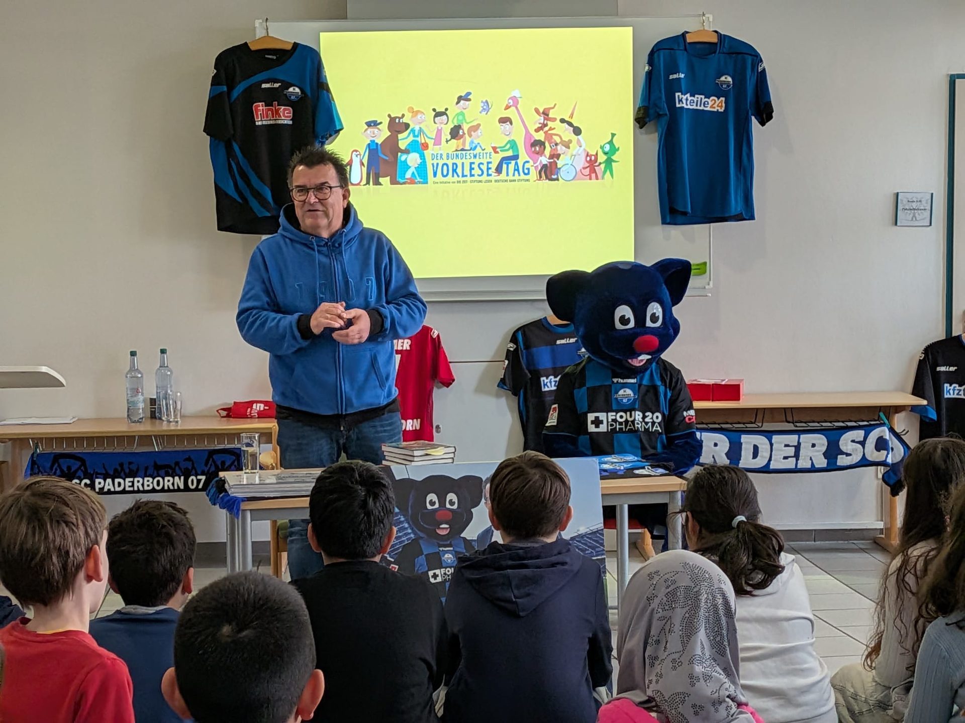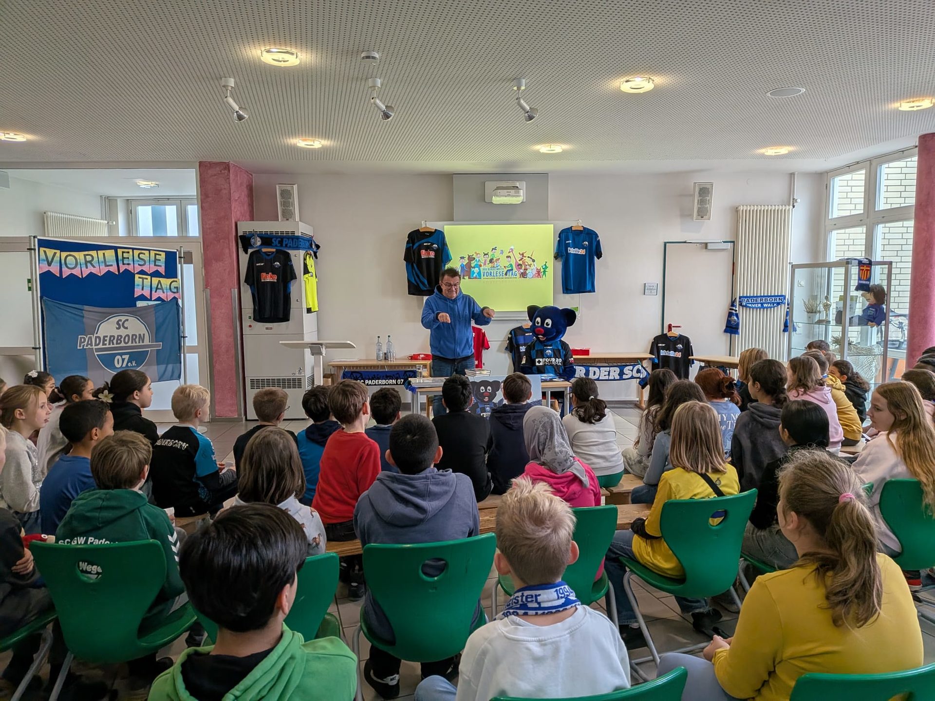 Für die Klassen des Jahrgang drei kam Besuch von den SchülerInnen des Goerdeler Gymnasiums. Die Fünftklässler lasen den dritten Klassen aus selbst ausgewählten Büchern vor. Das ist immer etwas ganz besonderes, weil viele ehemalige SchülerInnen uns dann besuchen kommen und die Freude entsprechend groß ist. Für die vierten Klassen gab es in diesem Jahr einen besonderen Besuch: Der Präsident des SC Paderborn Herr Hornb