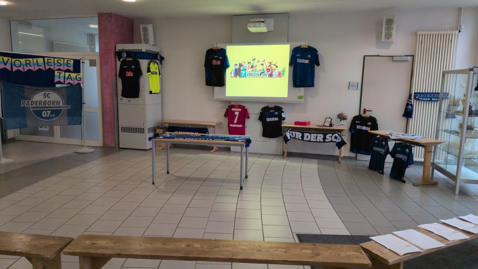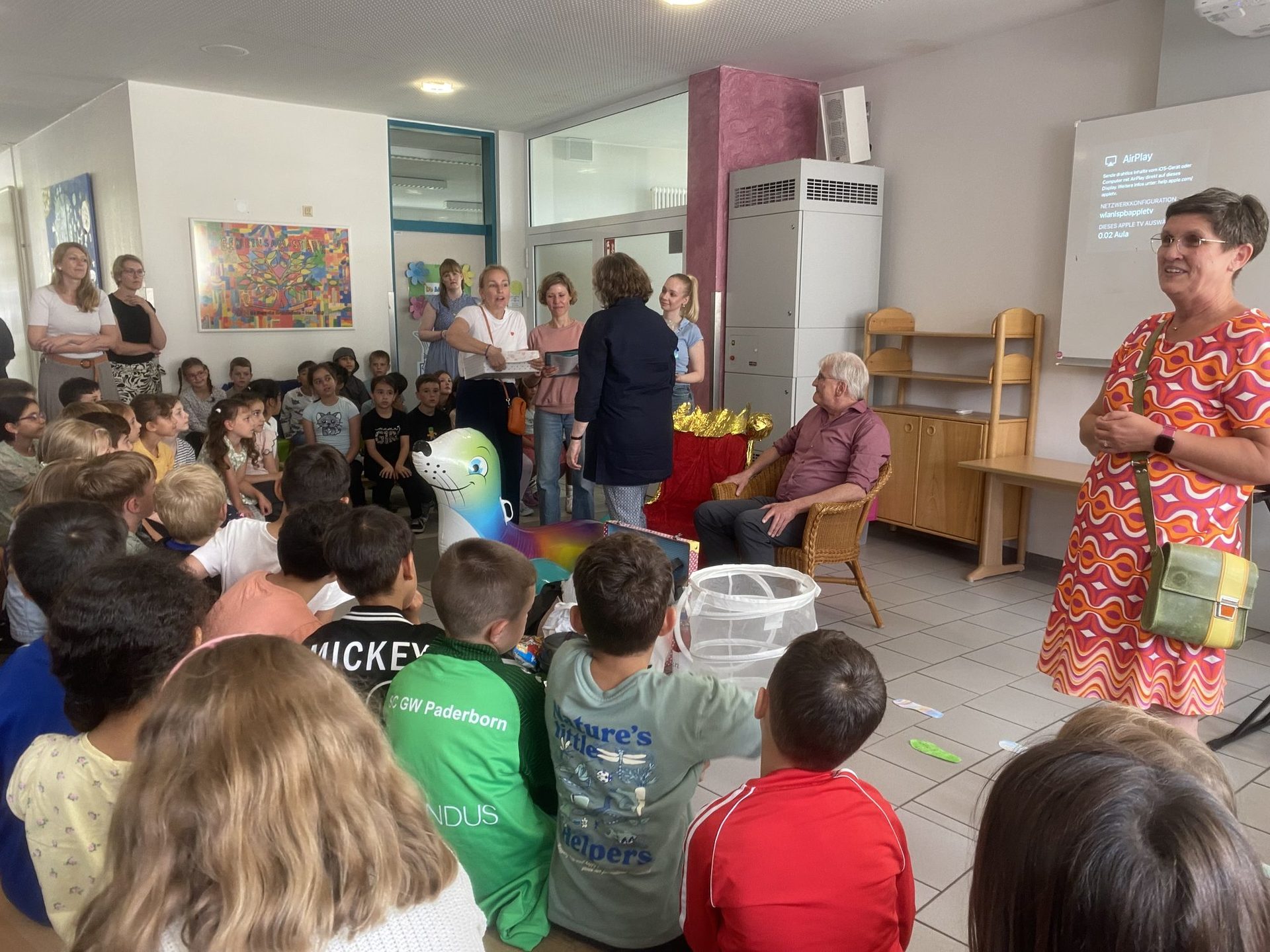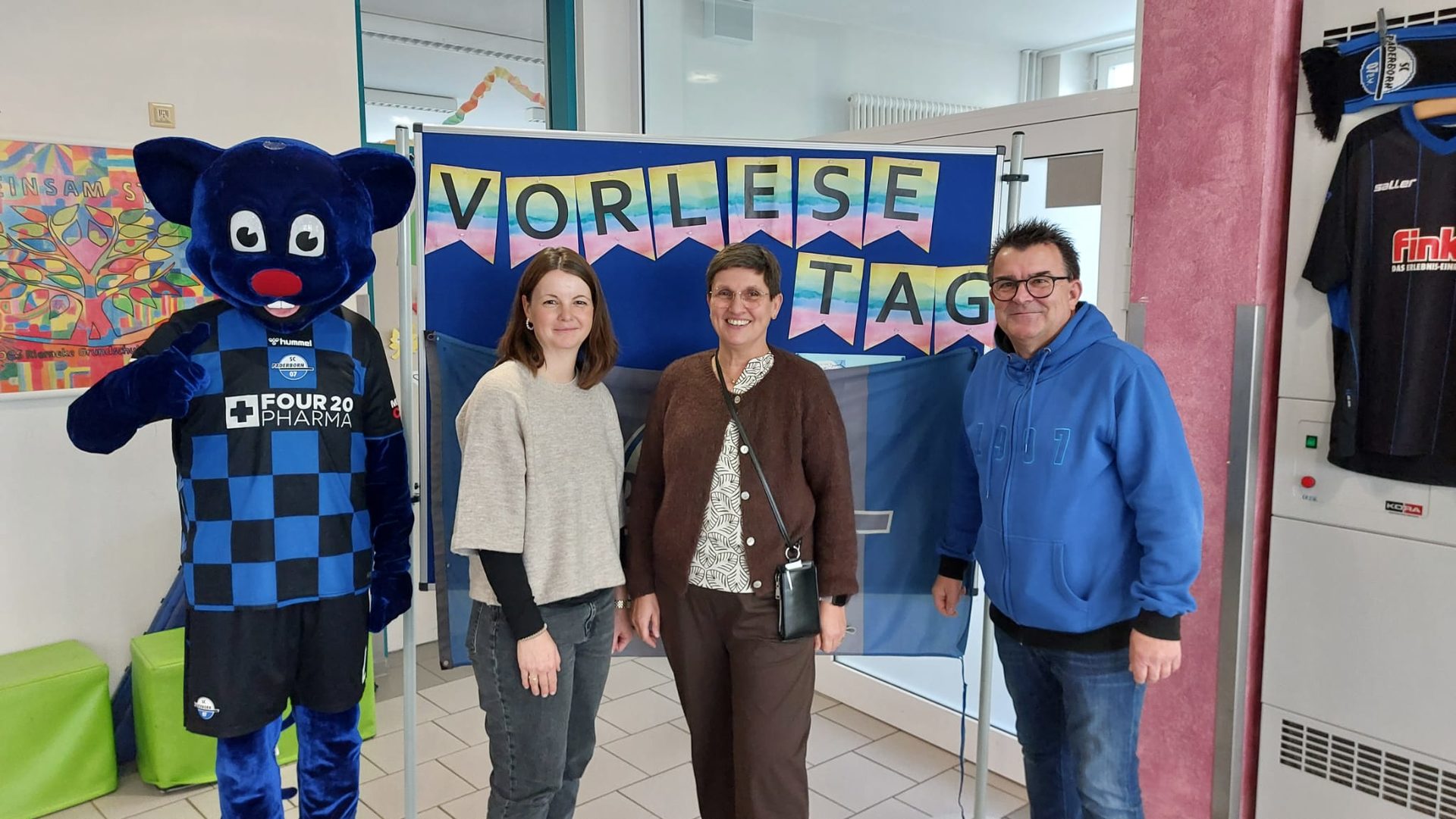 Für die Klassen des Jahrgang drei kam Besuch von den SchülerInnen des Goerdeler Gymnasiums. Die Fünftklässler lasen den dritten Klassen aus selbst ausgewählten Büchern vor. Das ist immer etwas ganz besonderes, weil viele ehemalige SchülerInnen uns dann besuchen kommen und die Freude entsprechend groß ist. Für die vierten Klassen gab es in diesem Jahr einen besonderen Besuch: Der Präsident des SC Paderborn Herr Hornb