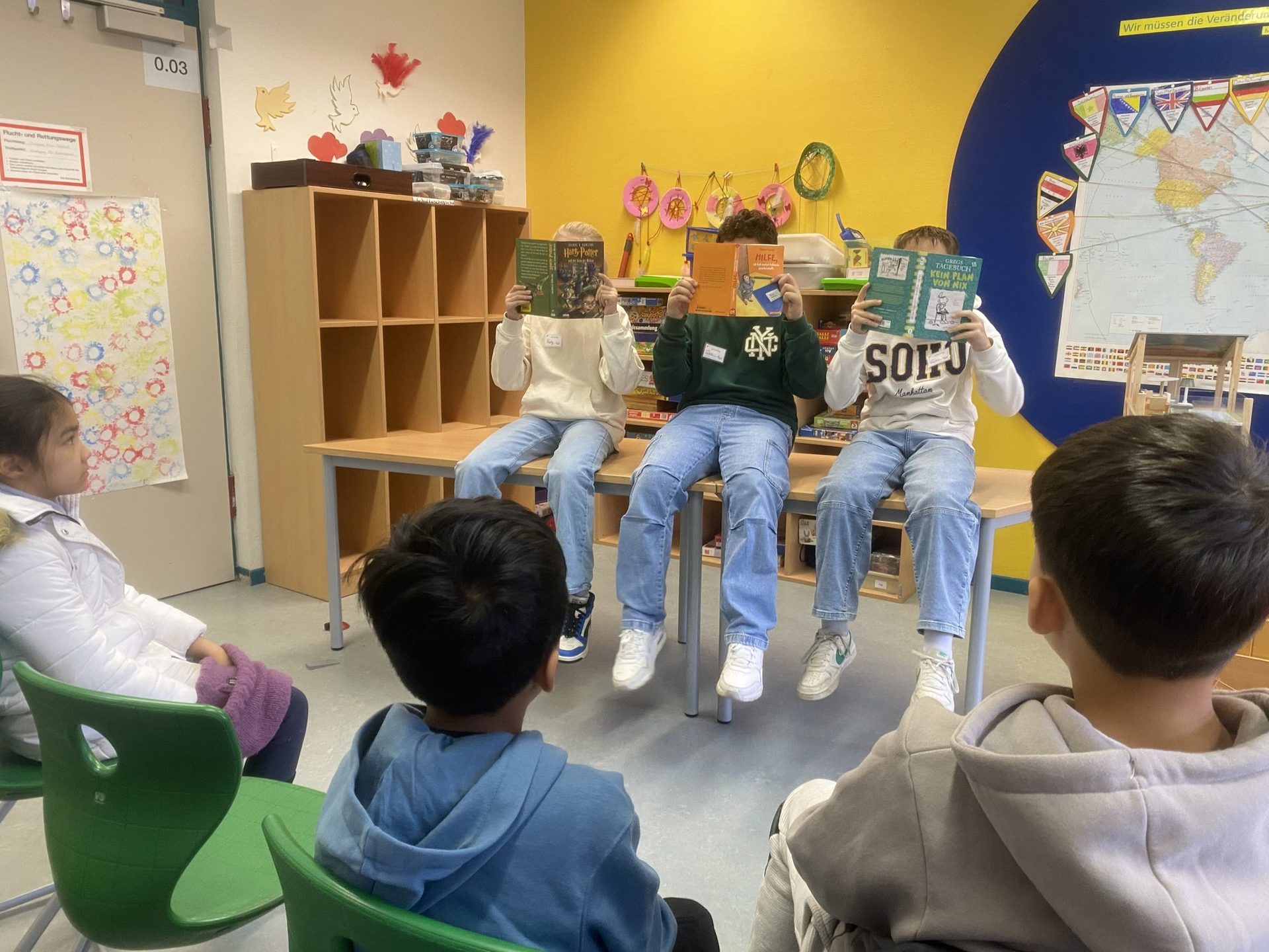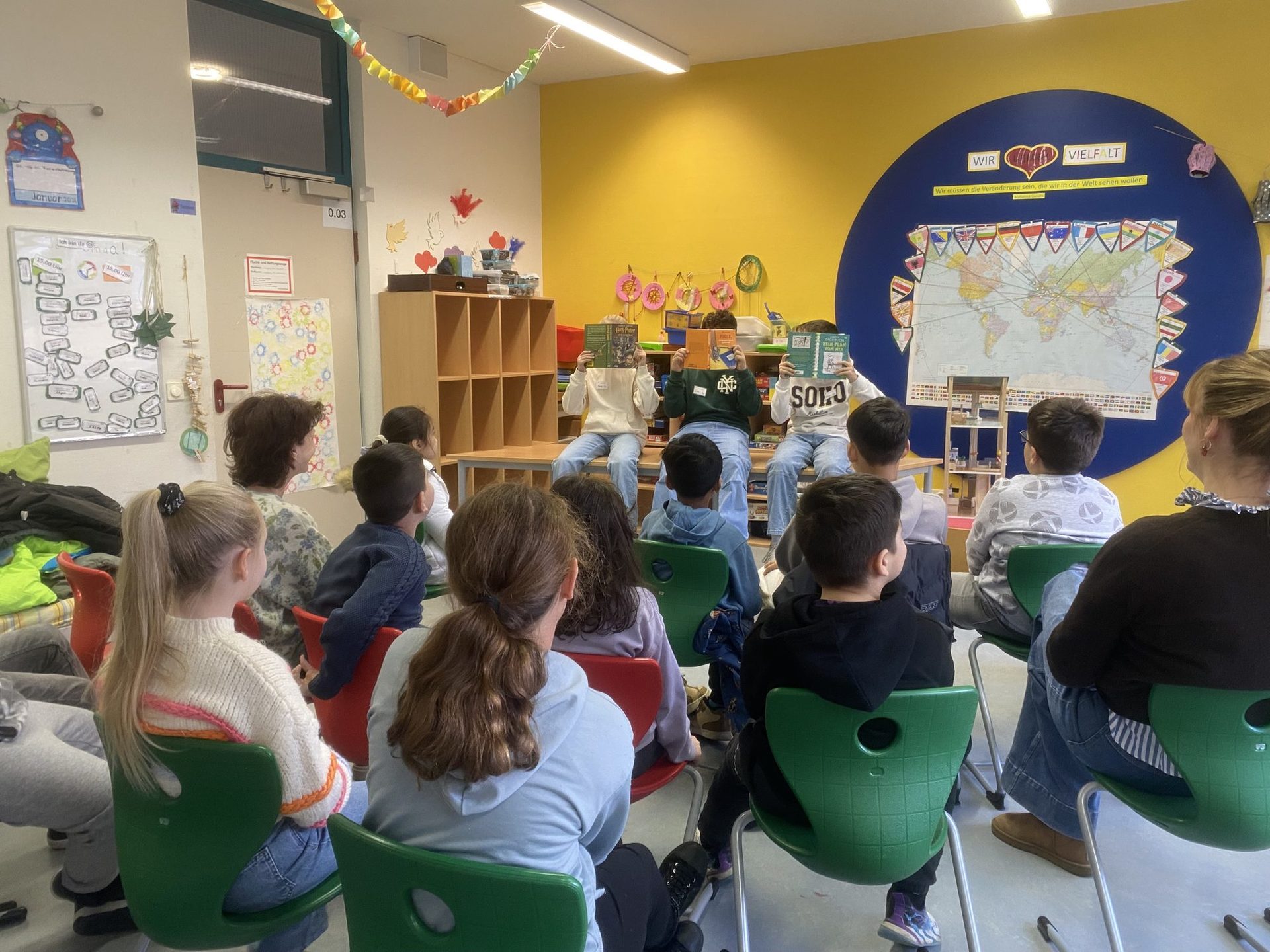Die Kinder der Jahrgänge 1 und 2 bekamen von den Lehrkräften vorgelesen. Dazu konnten sich die SchülerInnen Plakate der vorgelesenen Bücher anschauen und eintragen, welches Buch sie gerne vorgelesen bekommen möchten. So konnten die Kinder in die Welt der Bücher eintauchen.