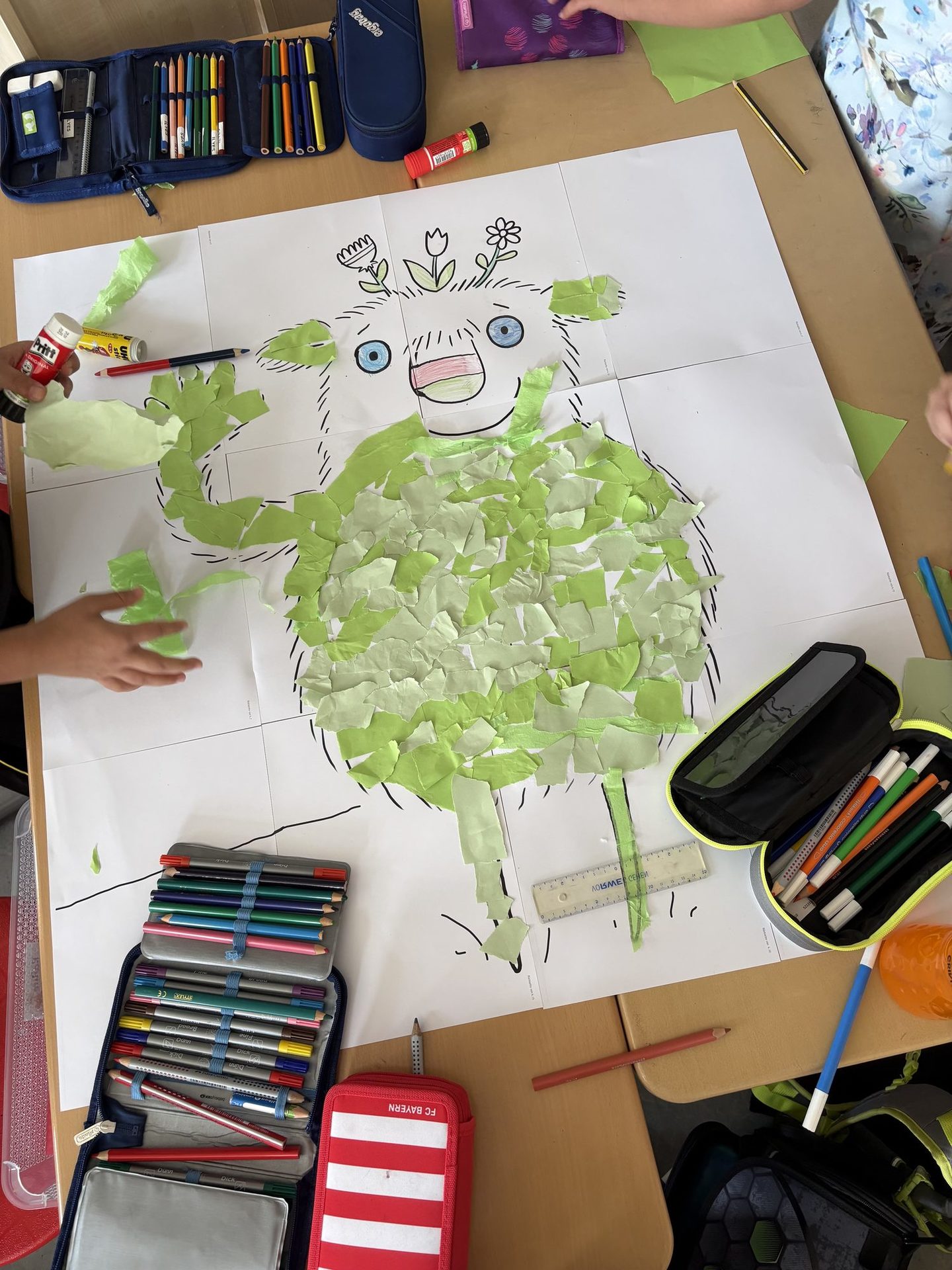 Zu Schulbeginn beschäftigen sich die SchülerInnen der 2c im Sachunterricht gemeinsam mit der Lehramtsanwärterin mit dem Thema "Ich in der Gemeinschaft, Ich in der Klasse". Dazu haben sie zunächst gemeinsam die Klassenregeln wiederholt und das neue Monatsziel besprochen. Darauf folgte eine gemeinsame Lese- und Erzählstunde mit dem Vorlesetheater zu dem Buch "Das kleine WIR in der Schule". Viele SchülerInnen kannten das kleine WIR bereits aus dem Kindergarten. In einer Gruppenarbeit hatten die SchülerInnen die Aufgabe gemeinsam die Vorlage des kleinen WIRs mit verschiedenen grünen Materialien zu bekleben. Am Ende der Stunde wurde gemeinsam reflektiert, wie die Zusammenarbeit in den Gruppen geklappt hat und woran die SchülerInnen dies gekannt haben.